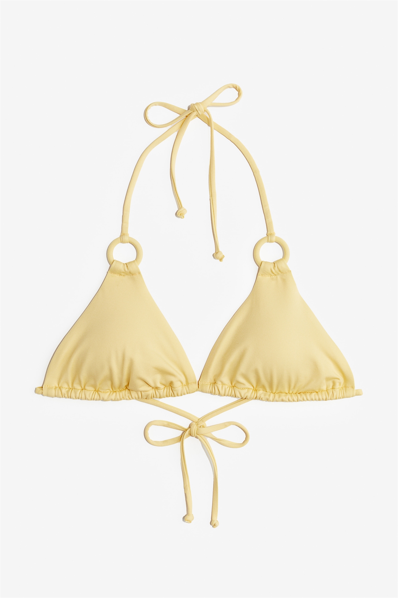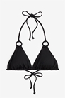 Бикини-треугольник без подкладки с декоративными кольцами спереди и чашечками со съемными вкладышами, которые формируют бюст и обеспечивают хорошую поддержку. Завязки сзади и на шее.