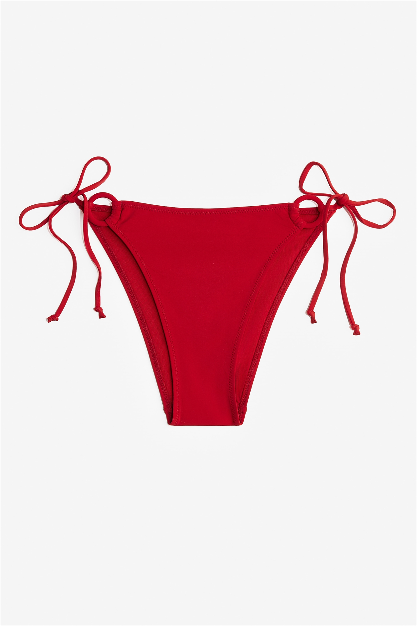 Трусы-бикини на подкладке с декоративными кольцами спереди. Средняя талия, завязки по бокам и вырез сзади.