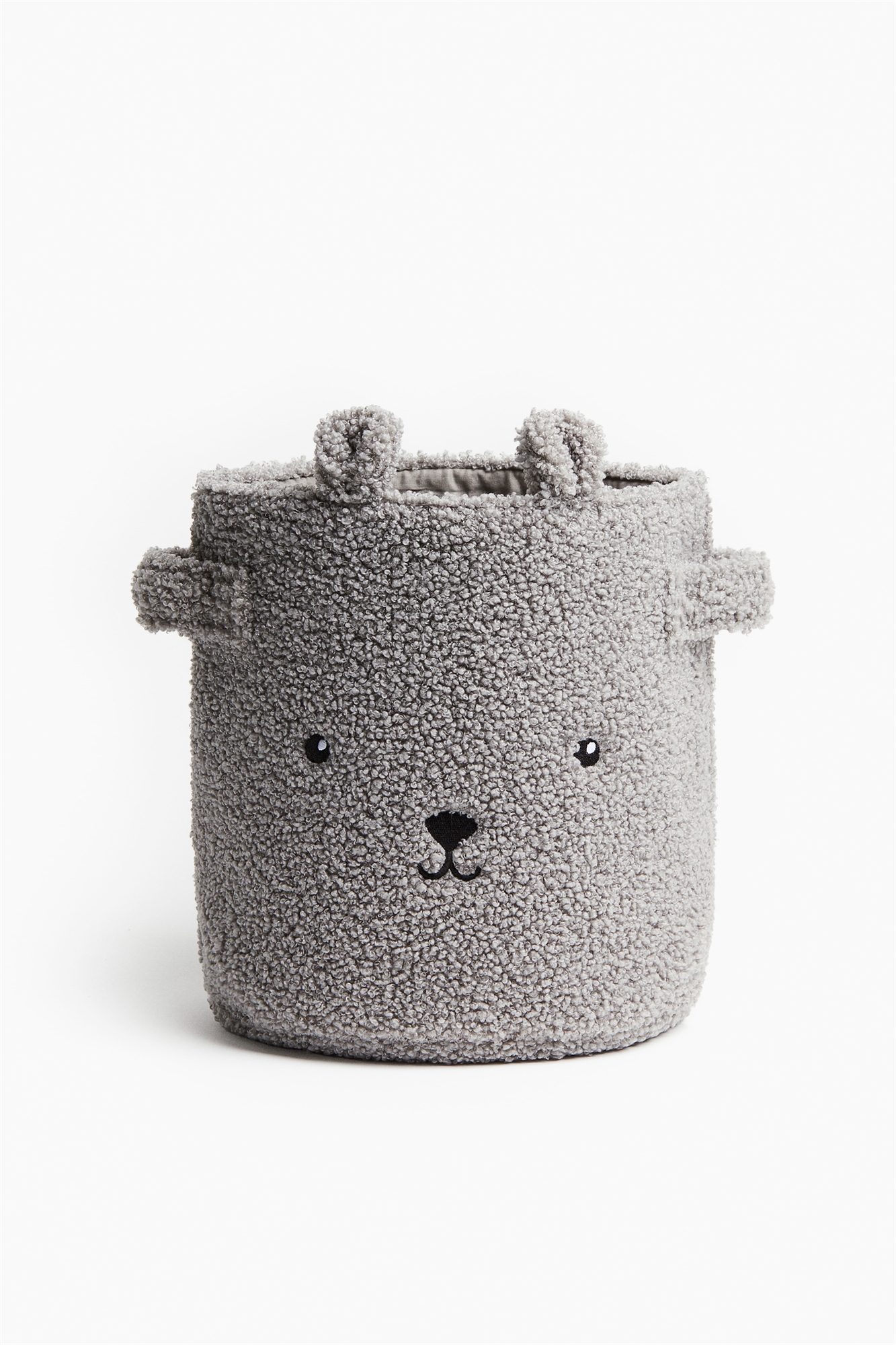 Небольшая цилиндрическая корзина для хранения из мягкого плюша с вышитым мотивом, аппликацией в виде ушек и двумя ручками. Диаметр 24 см. Высота 26 см.