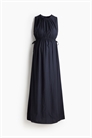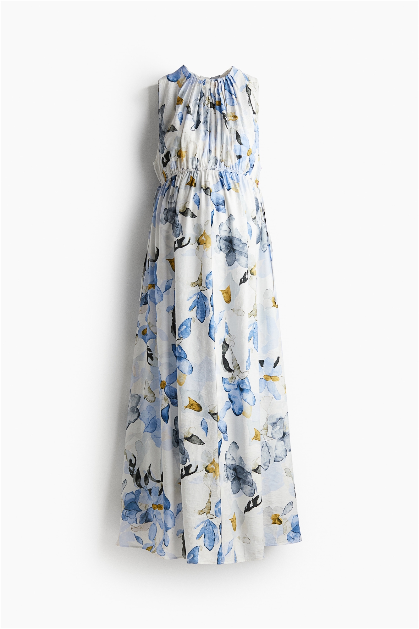 Платье длиной до щиколотки без рукавов из тканого материала. Круглый вырез со складками спереди и отверстие с потайными кнопками сзади на шее. Потайная резинка под бюстом и декоративные завязки по бокам. Без подкладки.