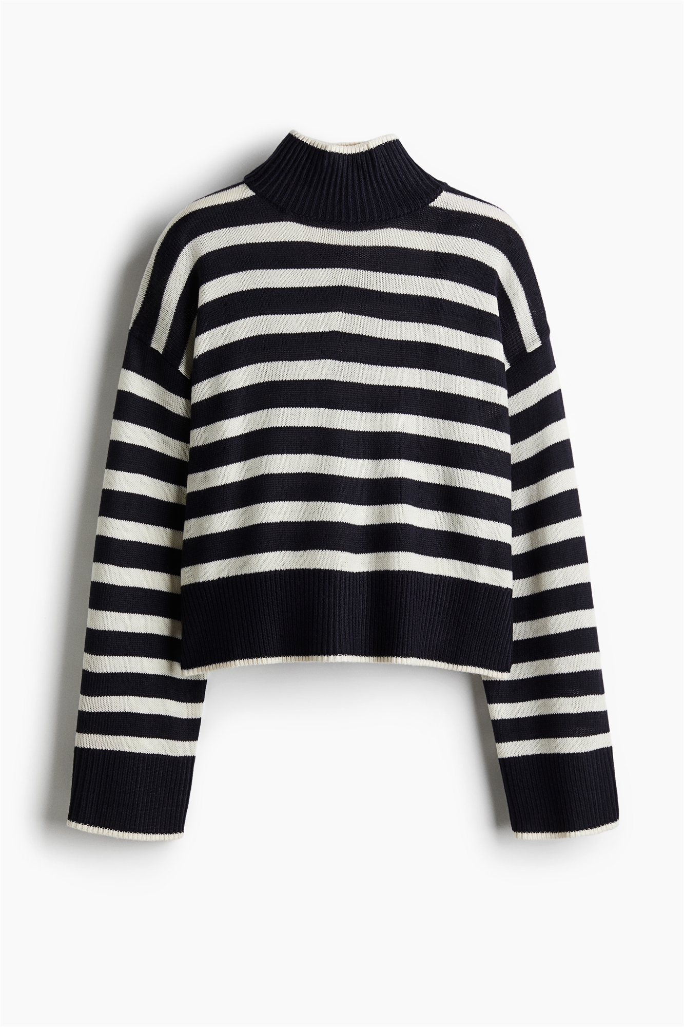 Короткий джемпер из мягкого тонкого трикотажа с ребристой черепаховой горловиной, спущенными плечами и длинными рукавами. Ребристые манжеты и подол. Разрезы по бокам подола.