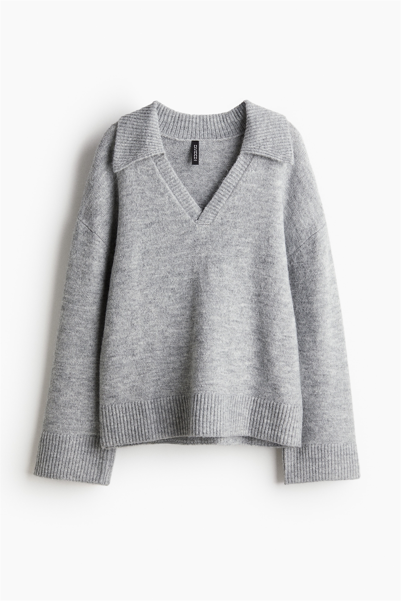 Джемпер из мягкого тонкого трикотажа с ребристым воротником и V-образной проймой спереди. Свободный крой с низко опущенными плечами, длинными рукавами и окантовкой на манжетах и подоле.