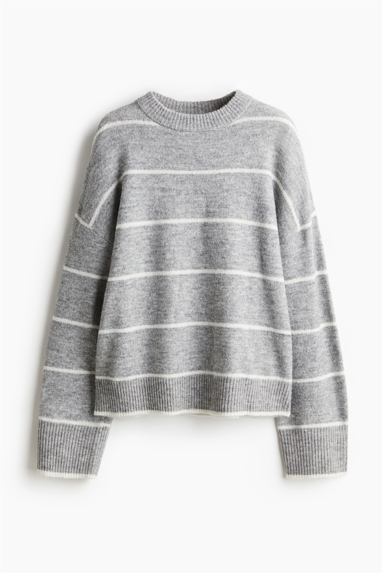 Джемпер свободного кроя из мягкого трикотажа с добавлением шерсти. Круглый вырез с ребристой отделкой, спущенные плечи и длинные рукава. Ребристые манжеты и подол.