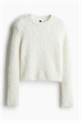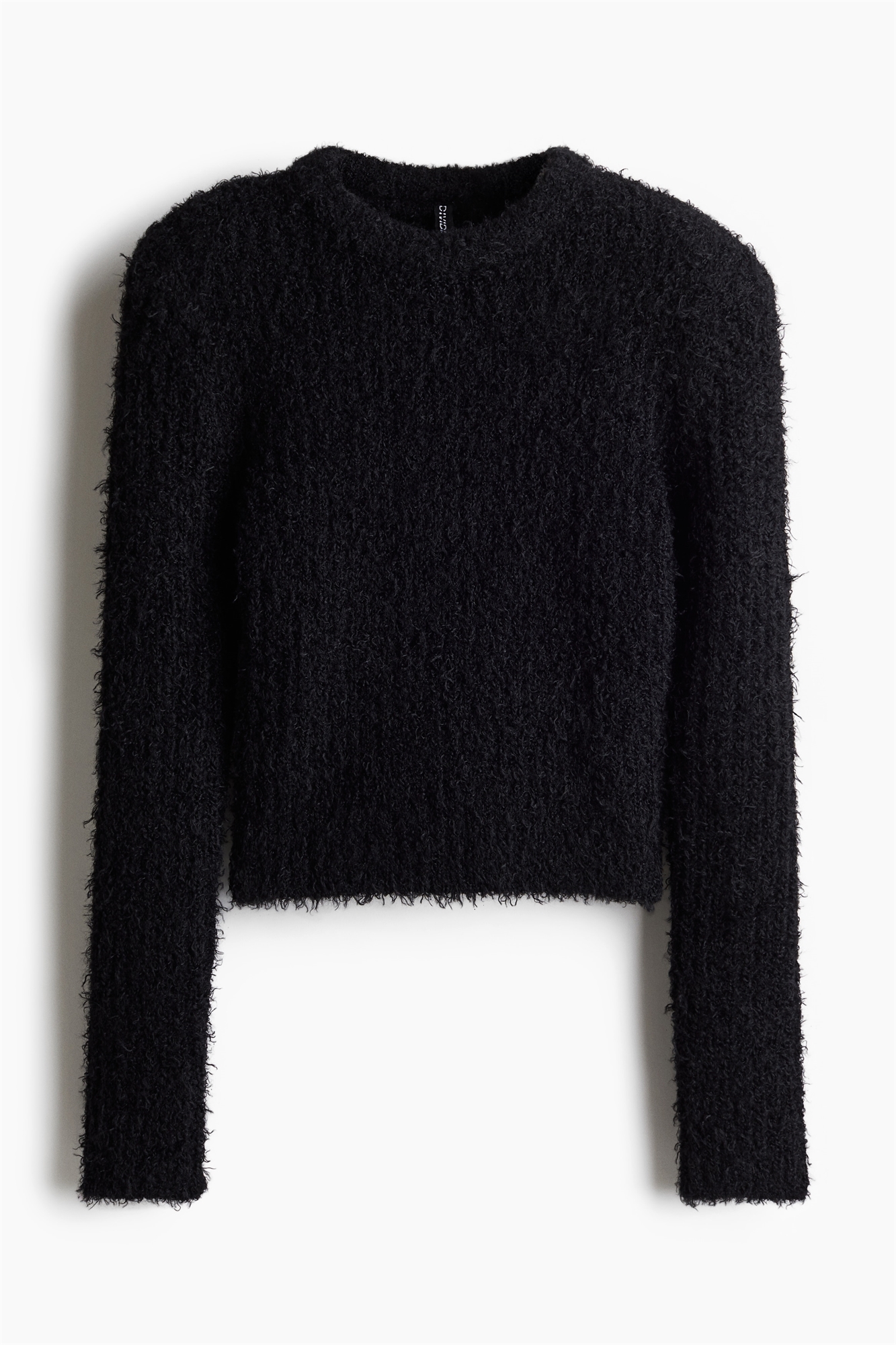 Короткий джемпер из мягкого пушистого трикотажа в рубчик с круглым вырезом, подплечниками и длинными рукавами.
