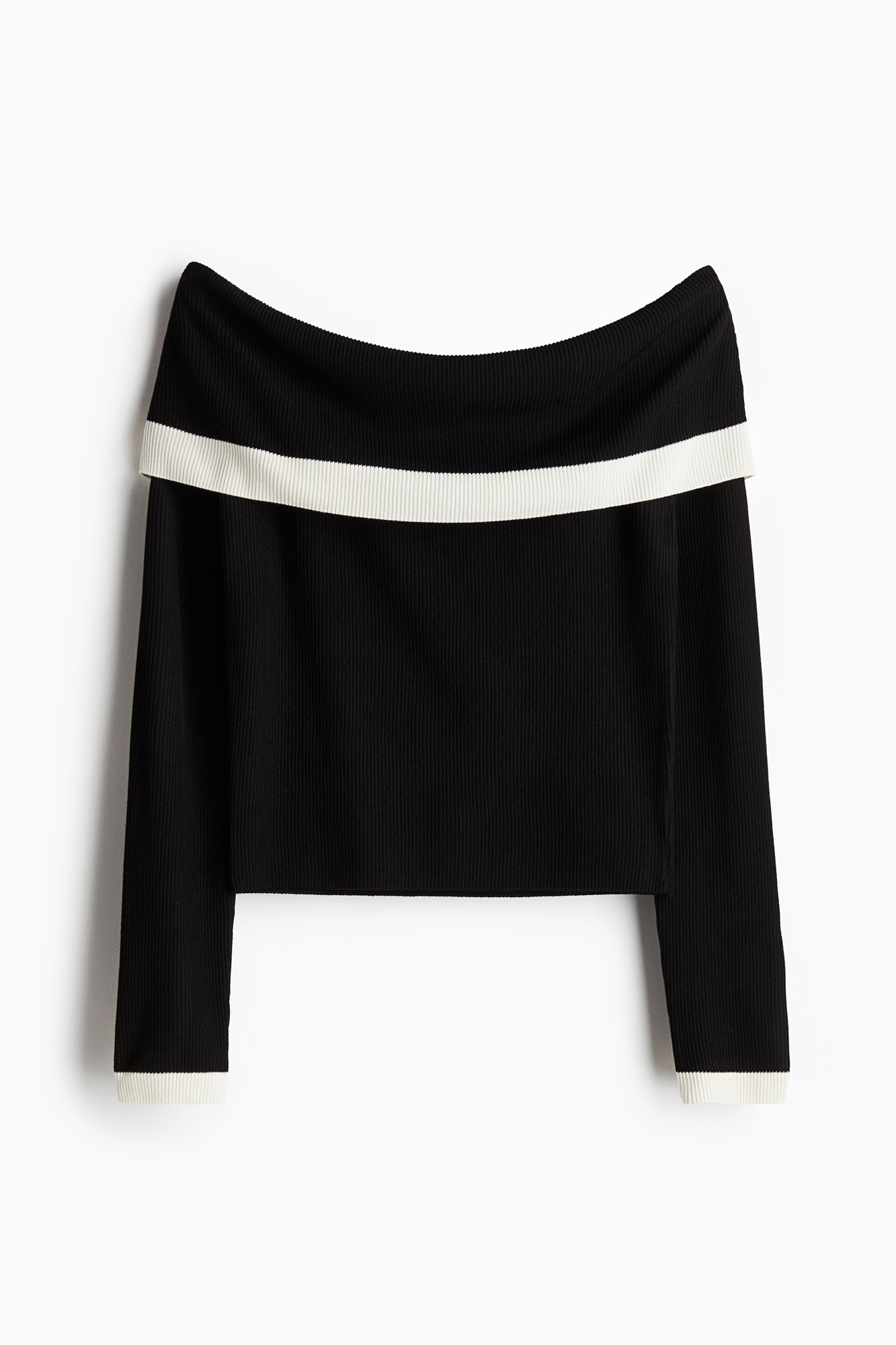 Короткий приталенный топ без плеч из тонкого трикотажа в рубчик с широким отложным краем и длинными рукавами.
