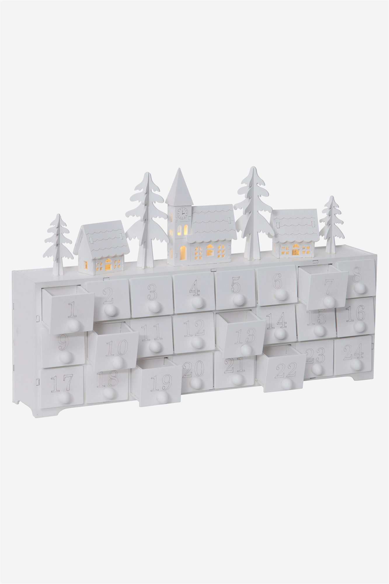 Декоративный адвент-календарь, вырезанный лазером, для использования в помещении. С 4 лампочками и красивыми деталями. Маленькие сюрпризы помещаются в выдвижные ящики. Очаровательный декоративный элемент излучает уютный свет. Работает от 2 батареек типа АА. Высота: 22,5 см. Ширина: 37,5 см. Глубина: 7,5 см.