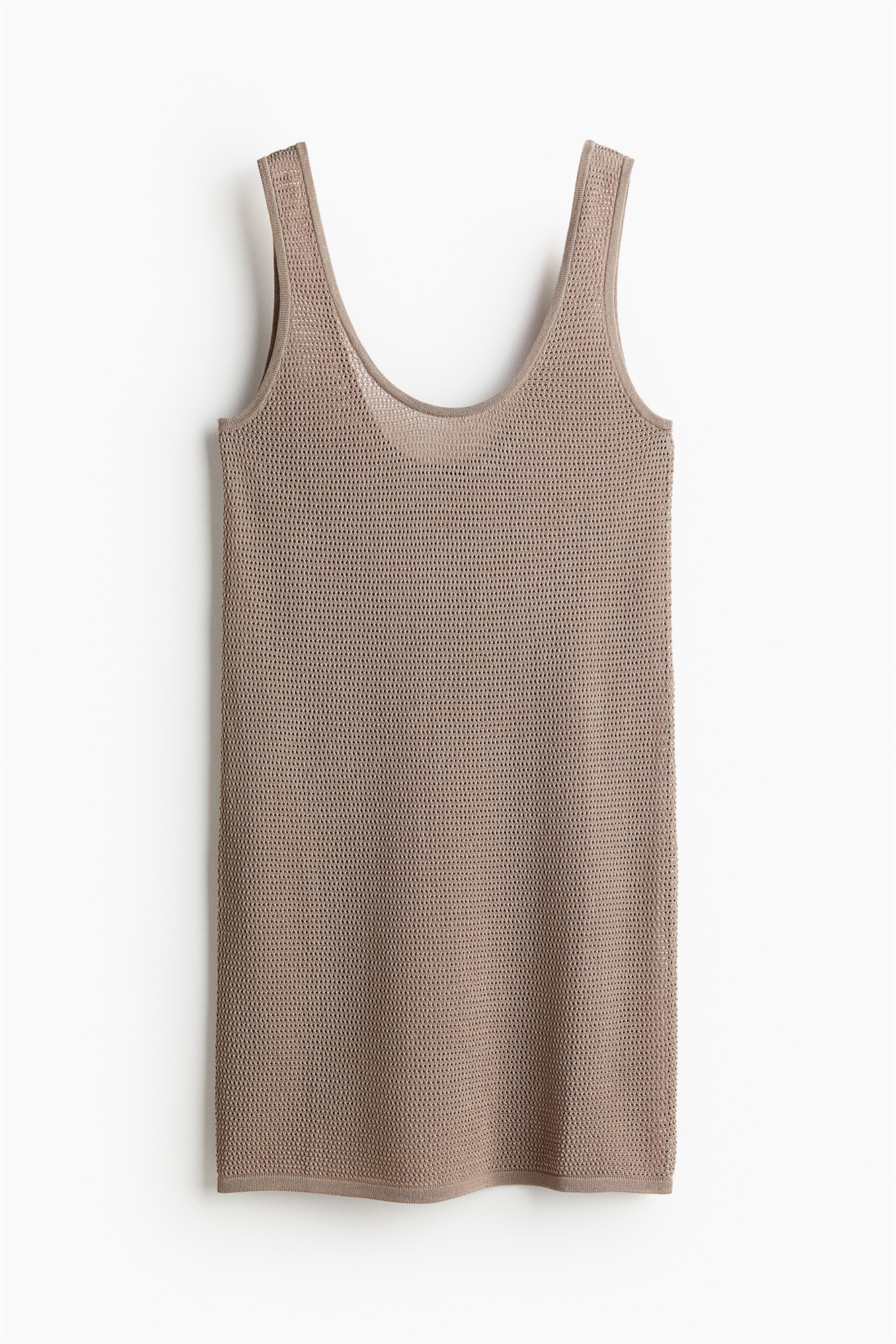 Короткое пляжное платье свободного покроя из мягкого трикотажа с дырочками, широкими бретелями и вырезом спереди и сзади. Без подкладки.