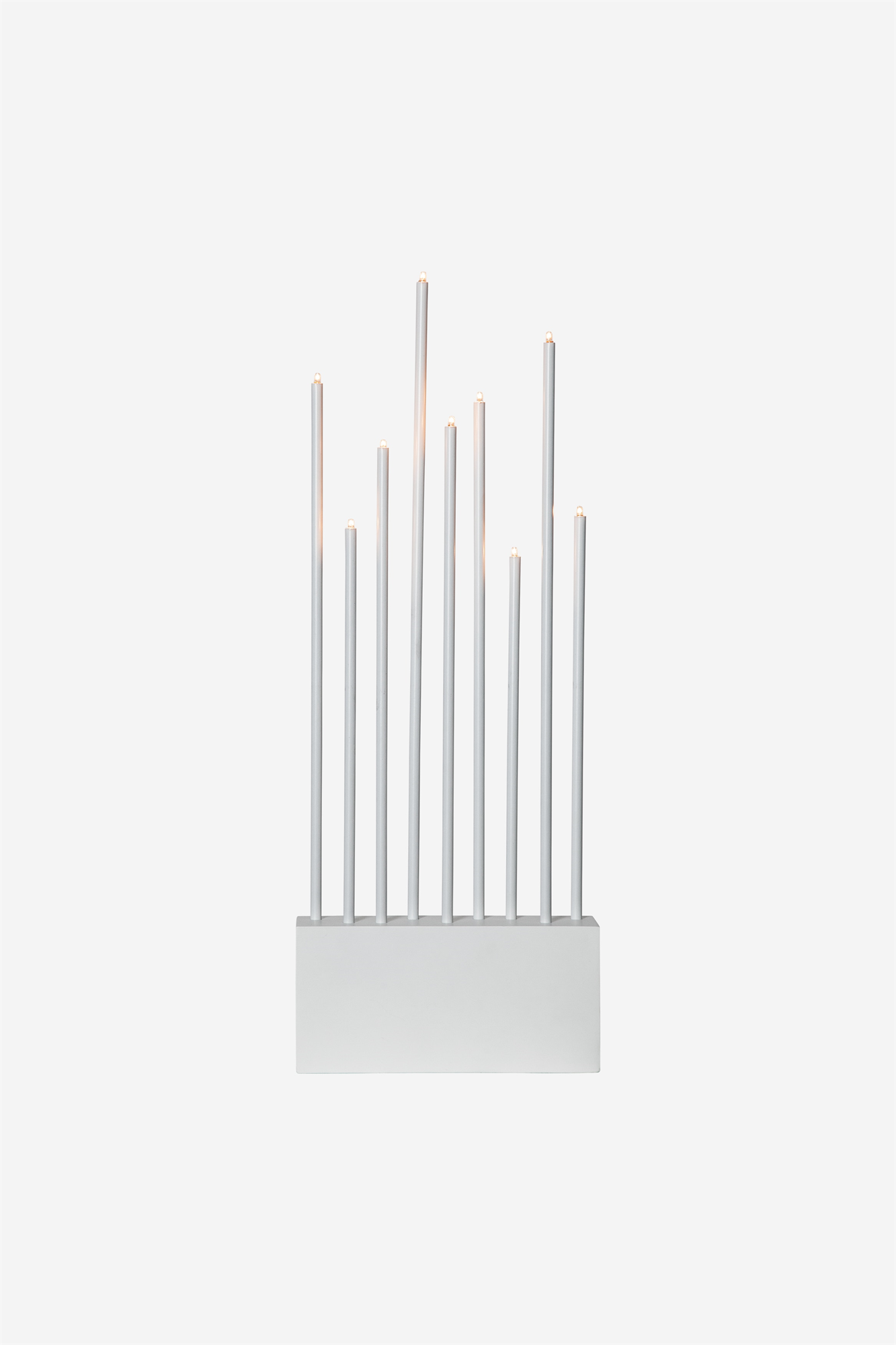 Неприхотливый подсвечник с прочным деревянным основанием и свечами из тонкой металлической трубки. 9 лампочек E5. Бело-серый текстильный кабель. Обеспечивает удивительно атмосферный свет круглый год. Высота: 60 см. Ширина: 23 см. Глубина: 6 см. Лампа 0,6 Вт 12VDC