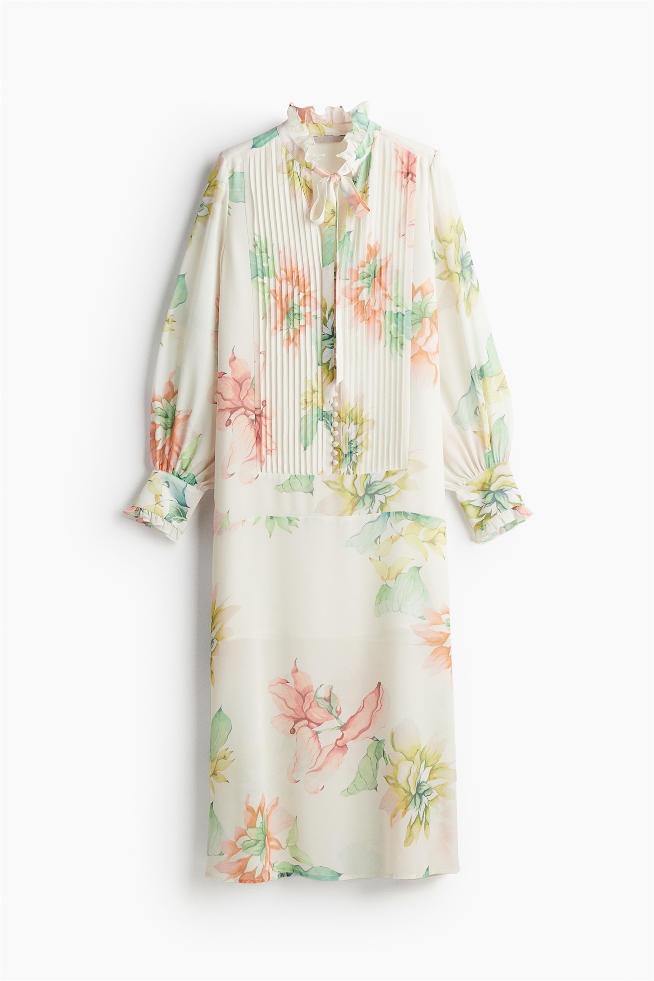 Платье свободного покроя из воздушного шифона длиной до колен с воротником с оборками и проймой с завязками в верхней части. Секция с пинтаками и закрытыми пуговицами спереди и двухслойным ярмом сзади. Длинные объемные рукава и широкие манжеты с оборкой и пуговицей. Частично на подкладке.