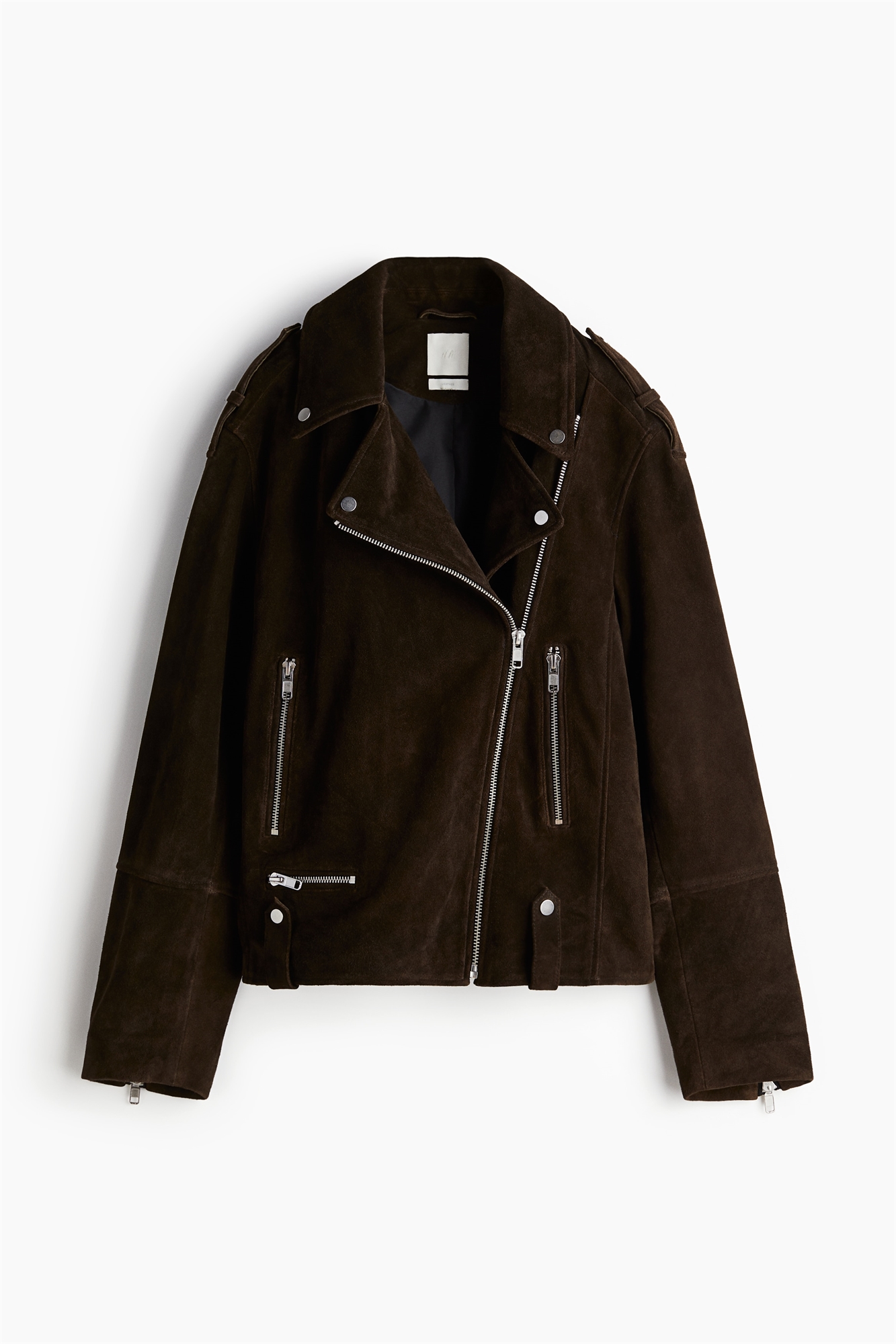 Свободная байкерская куртка из мягкой кожи с отворотами и диагональной застежкой-молнией спереди. Плечевые вставки с прижимной планкой и длинные рукава с застежкой на молнию сзади на манжетах. Монетный и боковые карманы на молнии. Декоративные петли для ремня на подоле. На подкладке.