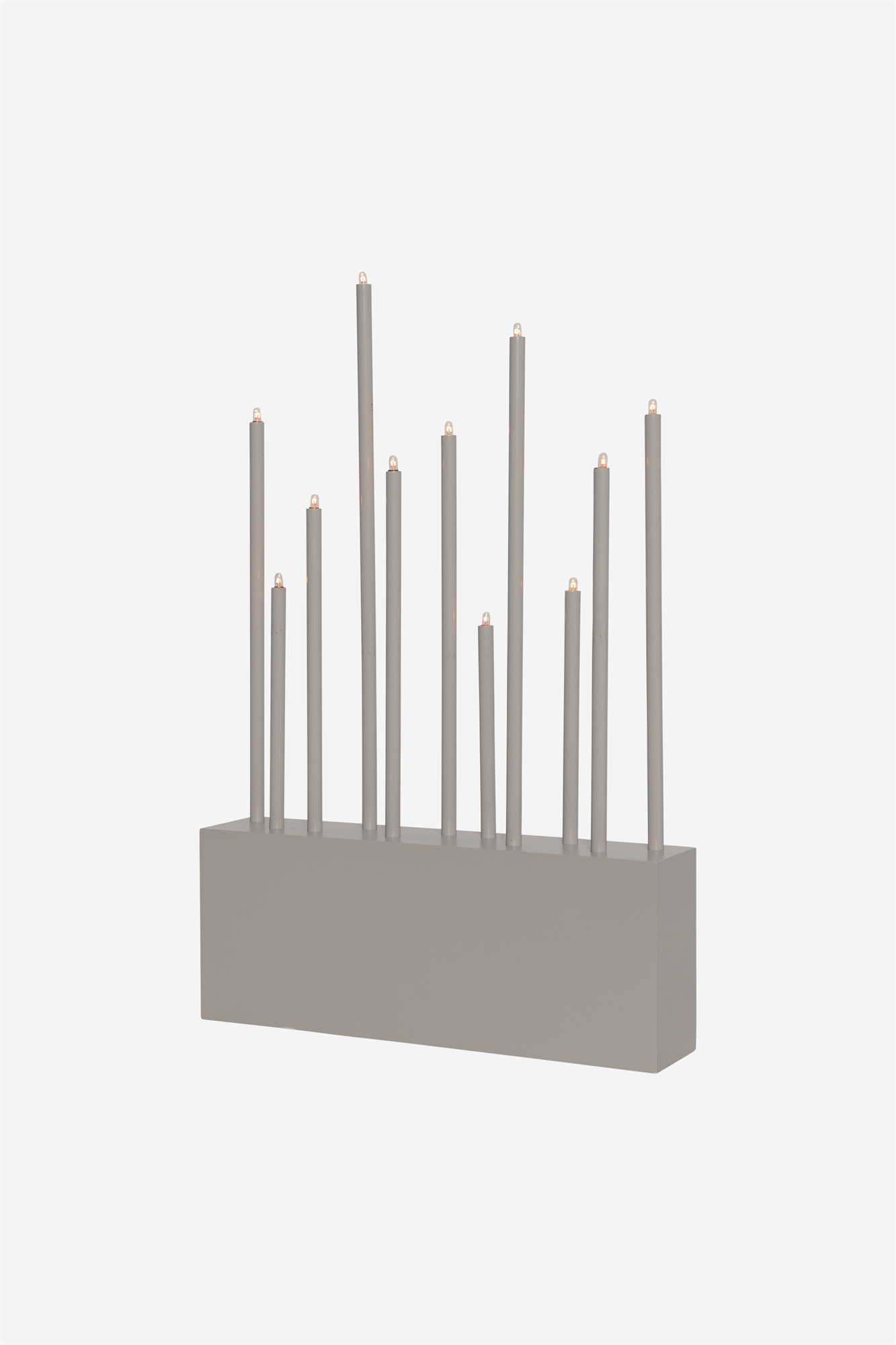 Неприхотливый подсвечник с прочным деревянным основанием и свечами из тонкой металлической трубки. 11 лампочек E5. Бело-серый текстильный кабель. Обеспечивает удивительно атмосферный свет круглый год. Высота: 43 см. Ширина: 28 см. Глубина: 6 см. Лампа 0,6 Вт 12VDC