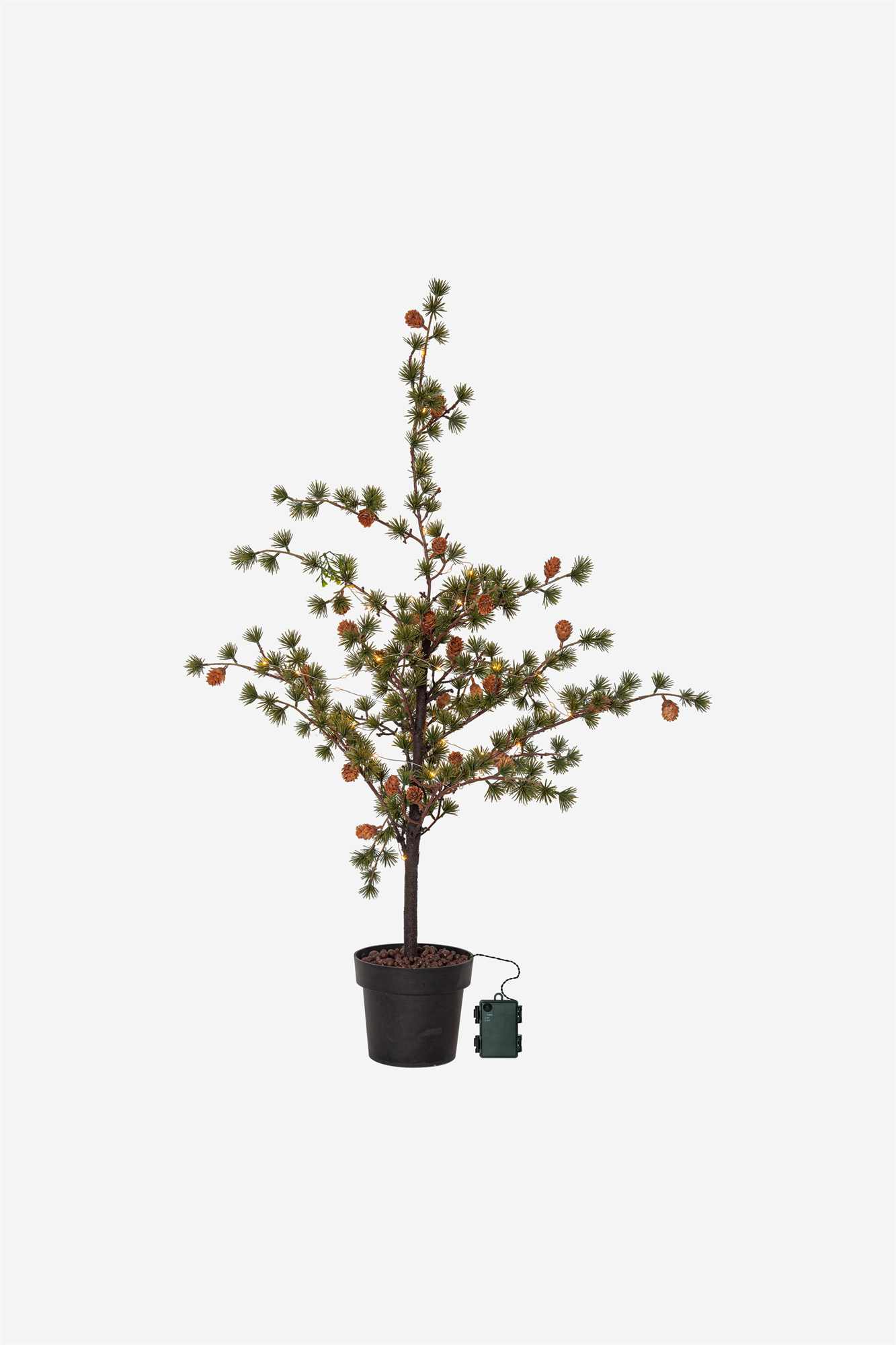 Лиственница высотой 115 см с коричневыми ветвями и хвоей, напоминающей хвою лиственницы. Они изготовлены из экологически чистого полиэтилена. Благодаря 40 точкам теплого белого света дерево излучает приятный свет, как на улице в качестве привлекательной зелени перед входной дверью, так и в коридоре или в детской комнате. Модель на батарейках (3 батарейки AA) оснащена таймером, при включении которого на выключателе дерево светится около 20 дней. Подходит для использования в помещении и на улице. Батарейки в комплект не входят. Высота: 117 см. Ширина: 60 см. Глубина: 60 см.