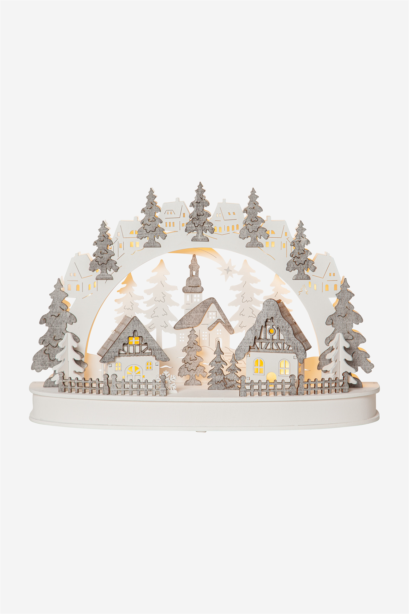 На этом детализированном подсвечнике из дерева, вырезанного лазером, изображена сцена с симпатичными домиками и аркой с декоративными елями, обрамляющими деревню. Прекрасное адвентское украшение, создающее атмосферную обстановку на окне или на серванте. Высота: 27 см. Ширина: 42 см. Глубина: 12 см.