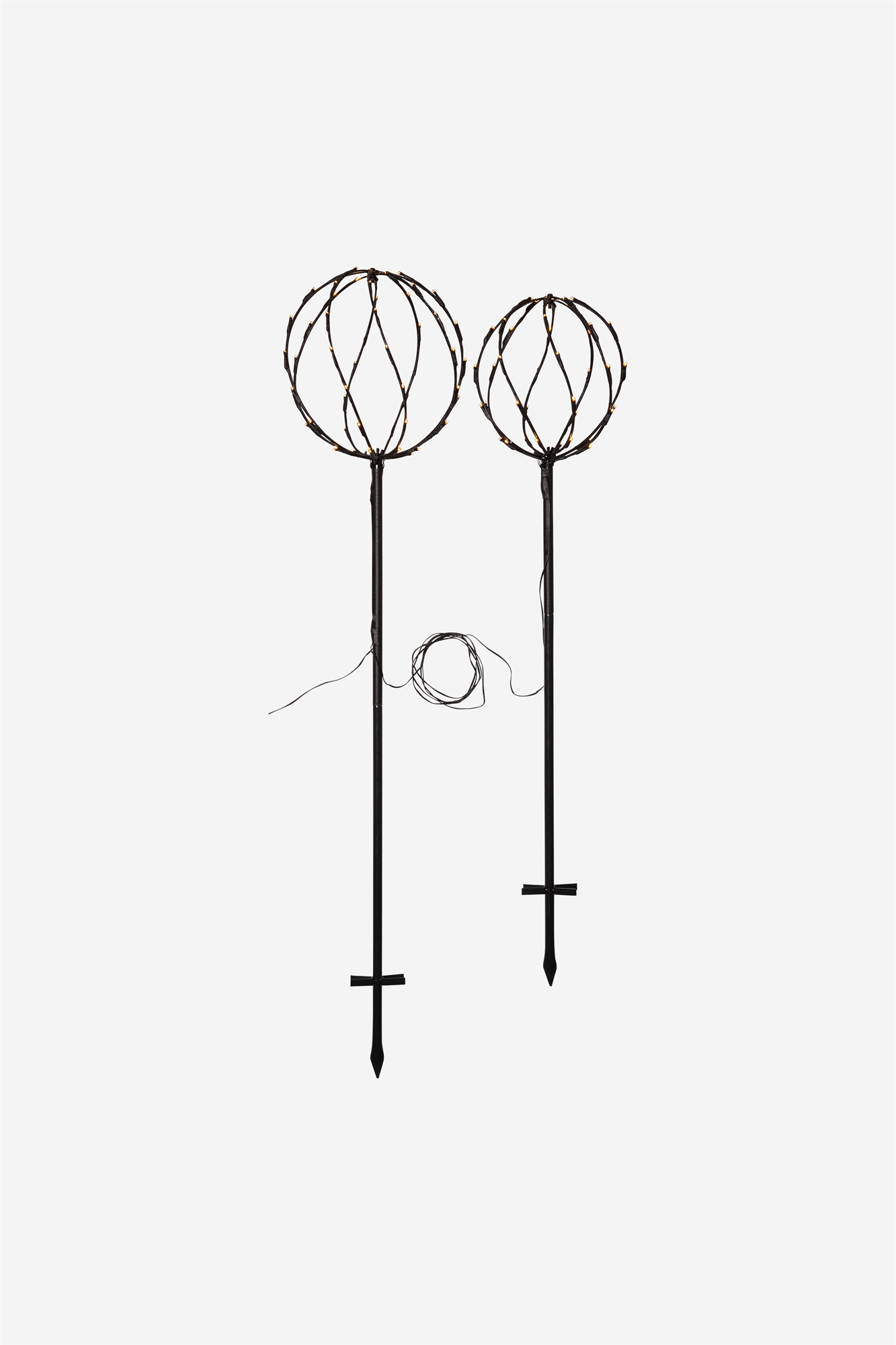 Декоративный набор для наружного освещения, состоящий из 2 сфер с 96 точками теплого белого света. Благодаря соединительному кабелю длиной 2,5 м сферы можно красиво расположить в саду, на террасе или балконе. Высота сферы: 130 см и 110 см. Диаметр сферы: 28 см или 23 см. Трансформер с классом защиты IP44. Высота: 130 см. Ширина: 250 см. Глубина: 28 см.