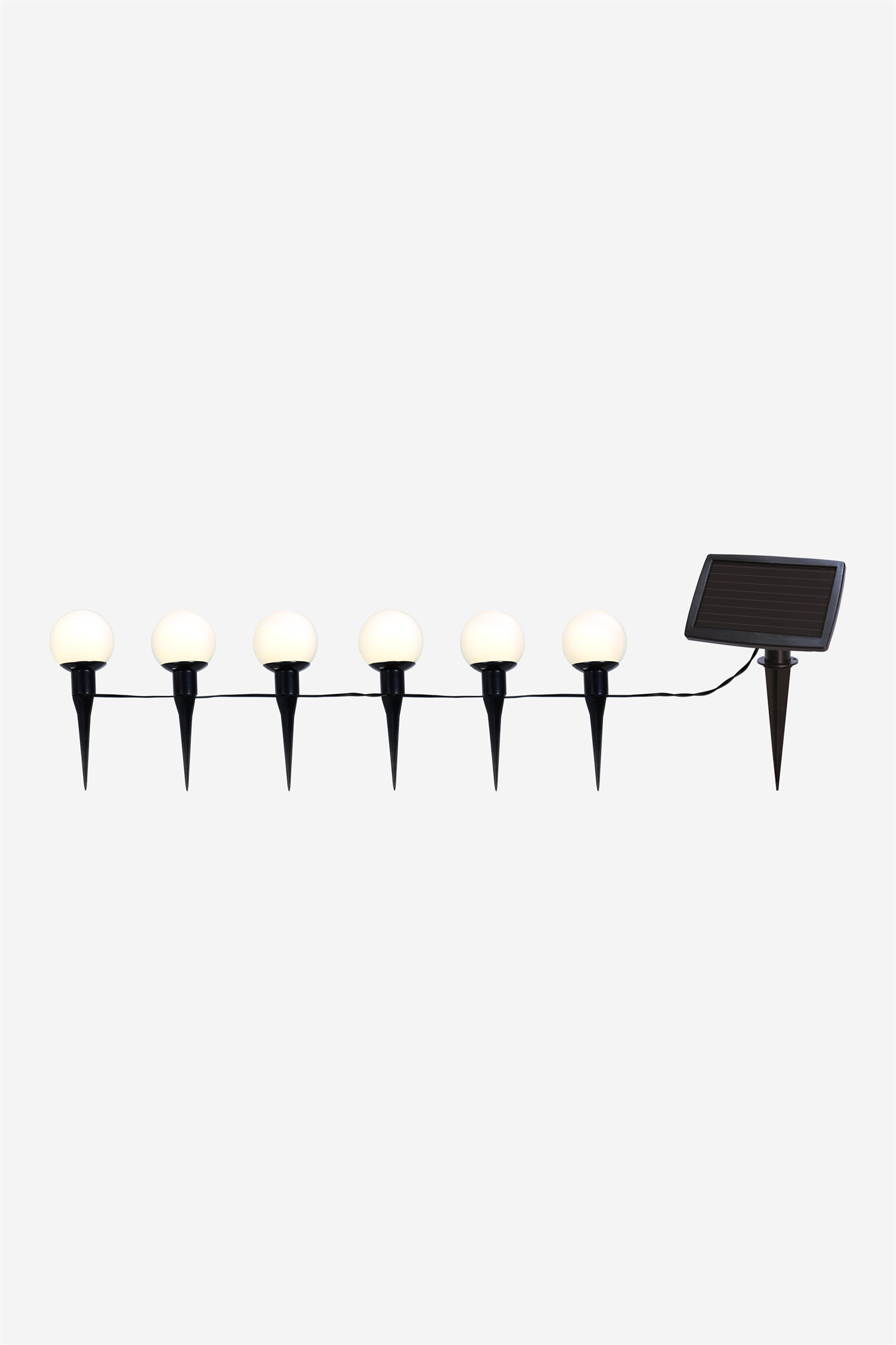 Цепочка солнечных светильников с глобусами, которые можно украсить подвесом или закрепить в земле с помощью съемных заглушек. В течение дня солнечные элементы используют солнечный свет для зарядки аккумулятора, чтобы впоследствии цепочка светилась в темноте. Благодаря отдельной солнечной панели цепь можно разместить в тени, а панель - на солнце. Длина кабеля 200 см. Высота: 9 см. Ширина: 500 см. Глубина: 6,5 см.