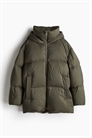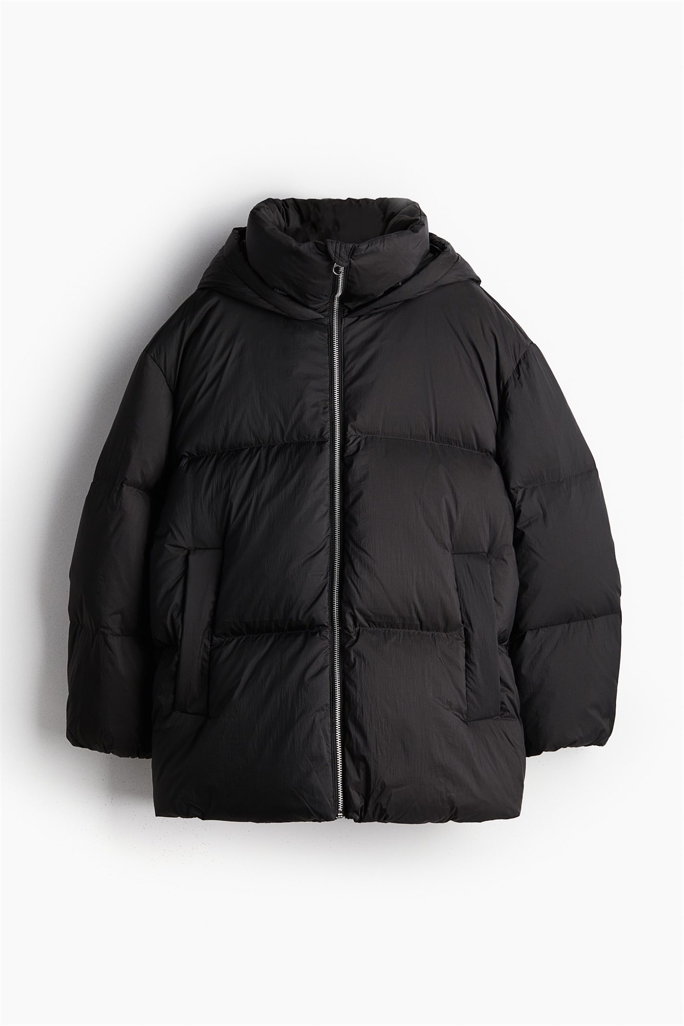 Пуховая куртка оверсайз из нейлона с наполнителем из пуха и пера. Воротник-стойка, капюшон с завязками и застежка-молния спереди. Спущенные плечи, длинные рукава, втачные боковые карманы и открытые внутренние карманы. Скрытый эластичный шнурок с ограничителями на подоле. На подкладке.