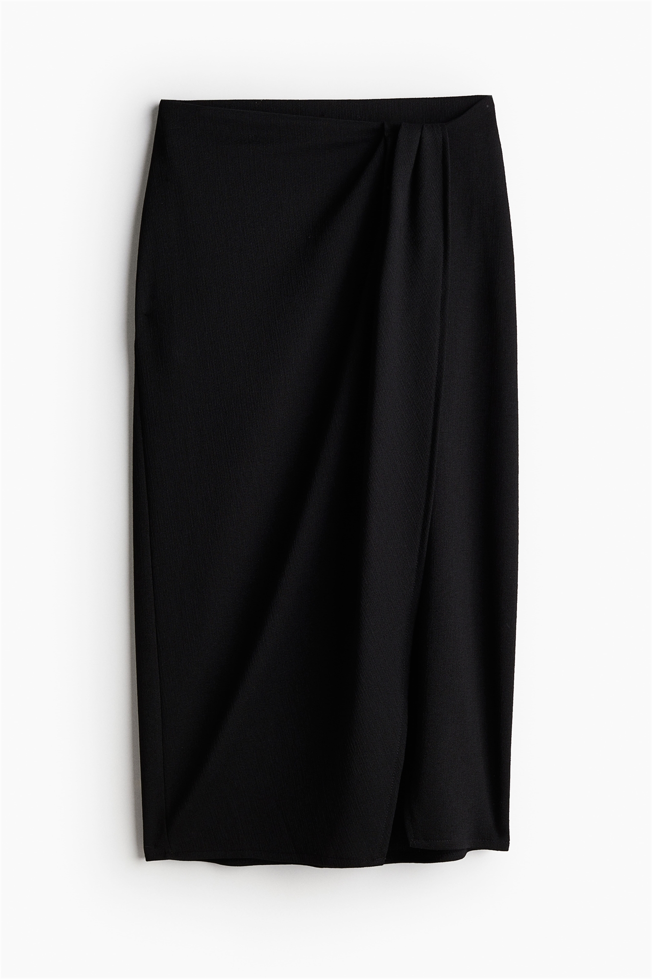 Юбка длиной до колен из фактурного трикотажа со скрытой резинкой сзади на талии и пришитыми складками спереди, создающими эффект легкой драпировки.