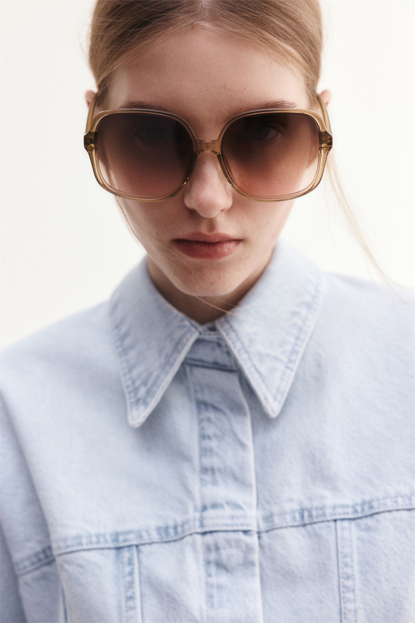 Большие солнцезащитные очки в ретро-стиле с пластиковой оправой и боковыми дужками. Тонированные пластиковые линзы с УФ-защитой.