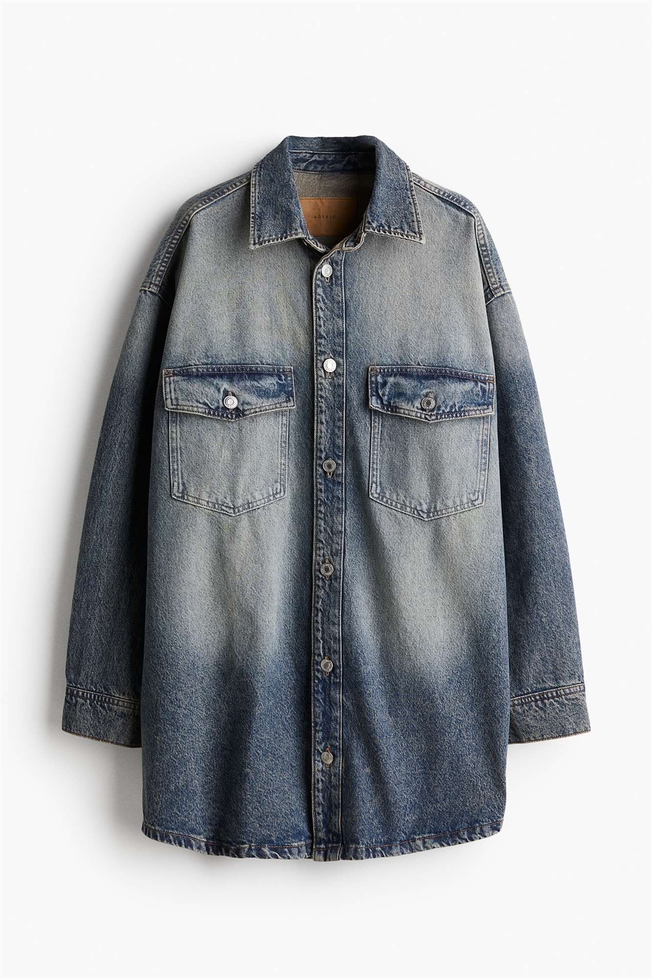 Рубашка оверсайз из жесткого хлопкового денима с воротником, металлическими пуговицами спереди, передом и накладными нагрудными карманами с пуговицей. Спущенные плечи, направленные вперед плечевые швы, манжеты на пуговицах и закругленный подол. Немного длиннее сзади.