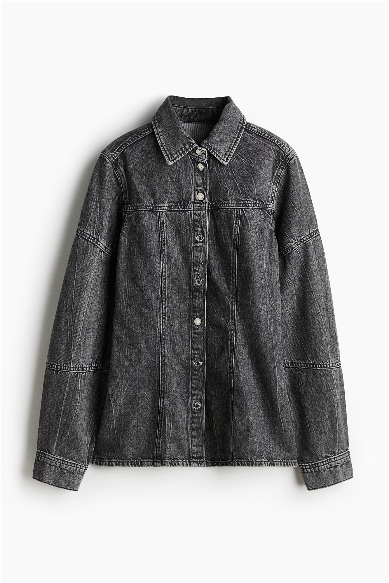 Рубашка из жесткого хлопкового денима с воротником и пуговицами спереди и на манжетах.