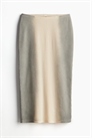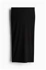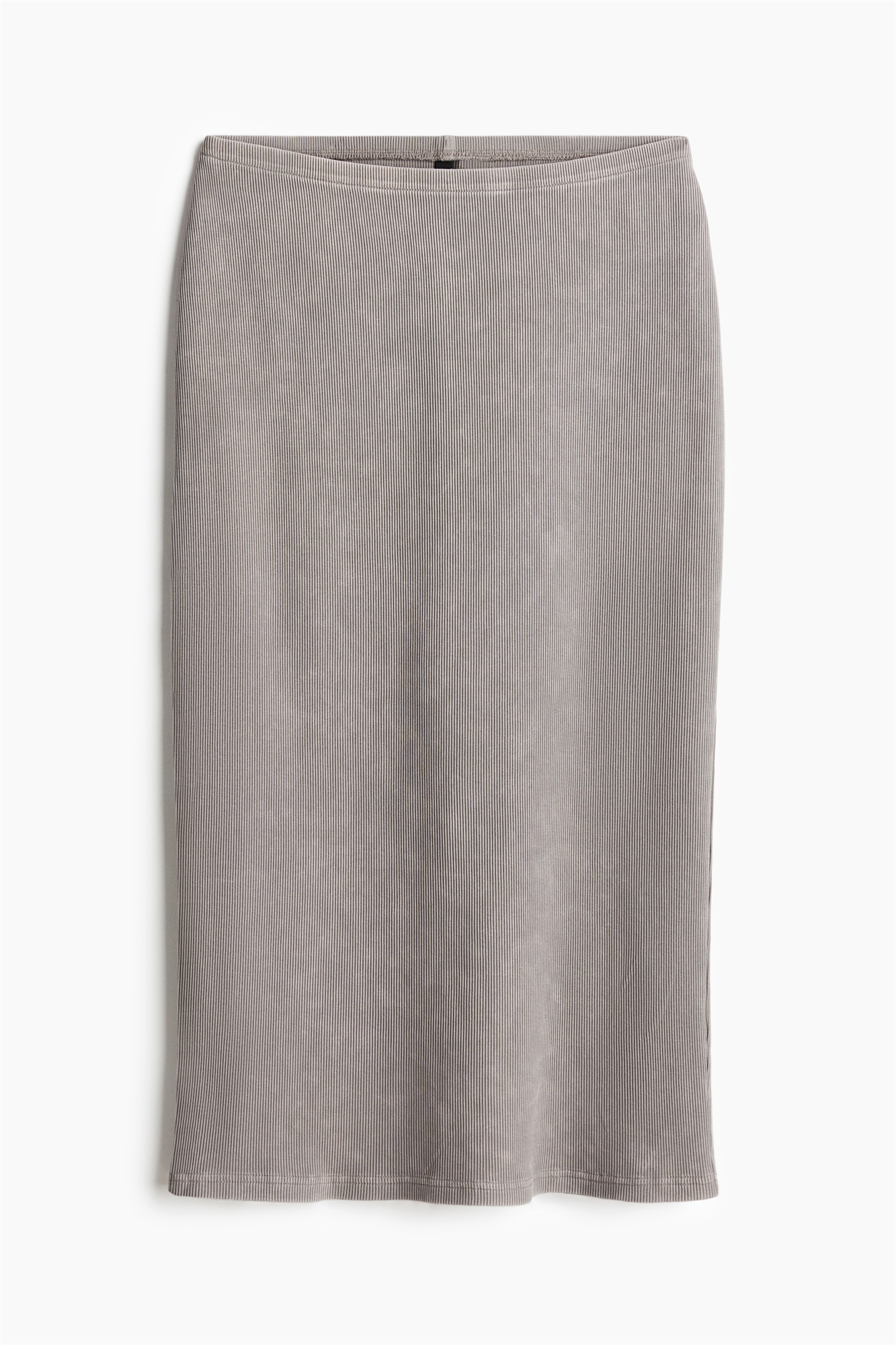 Приталенная юбка длиной до колен из ребристого трикотажа со скрытой эластичной резинкой на талии и прямым подолом с высоким разрезом сзади.