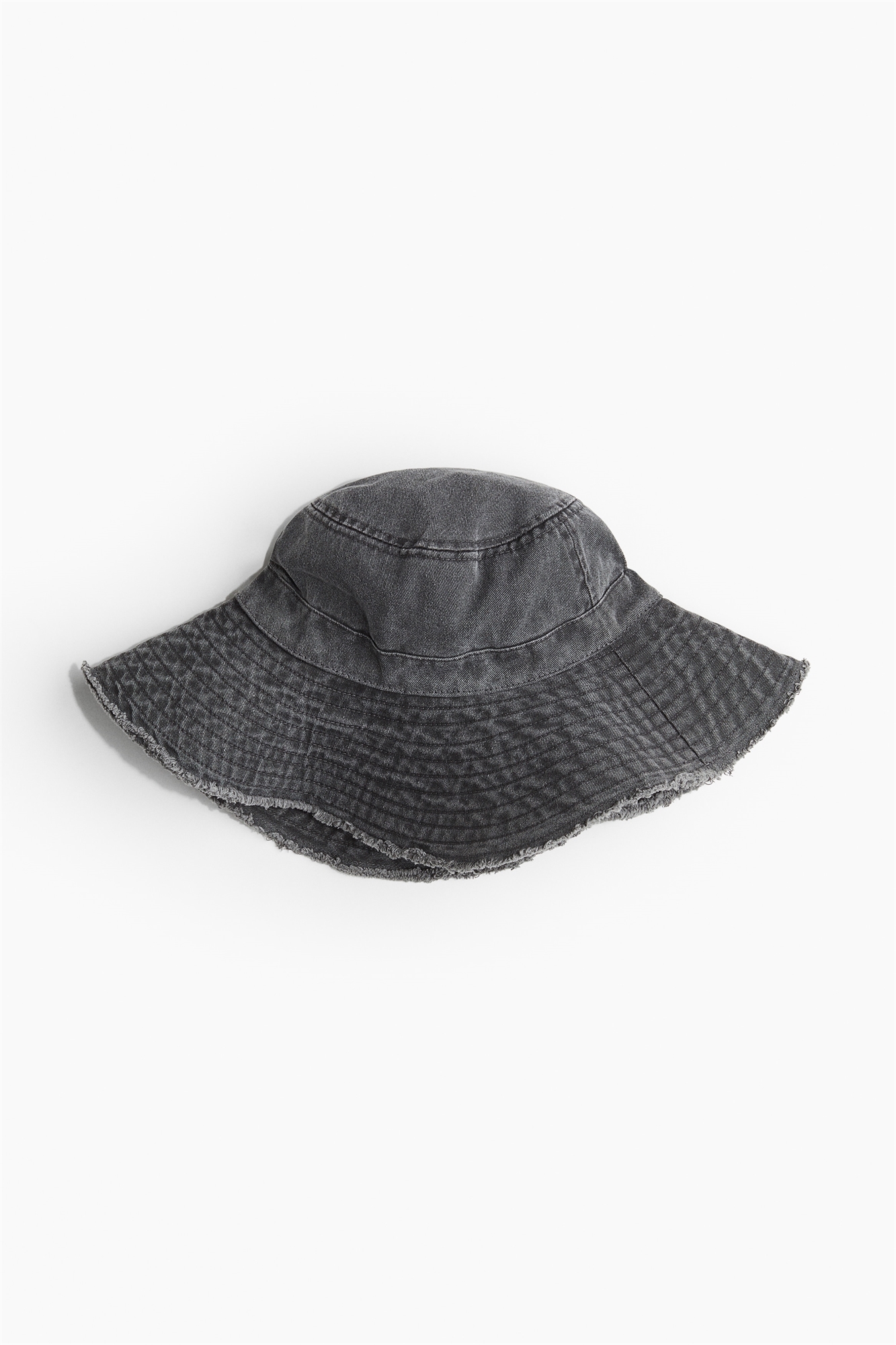 Шляпа-ведро из хлопковой саржи с обтрепанным краем и хлопковым начесом. Ширина по краю 9 см.