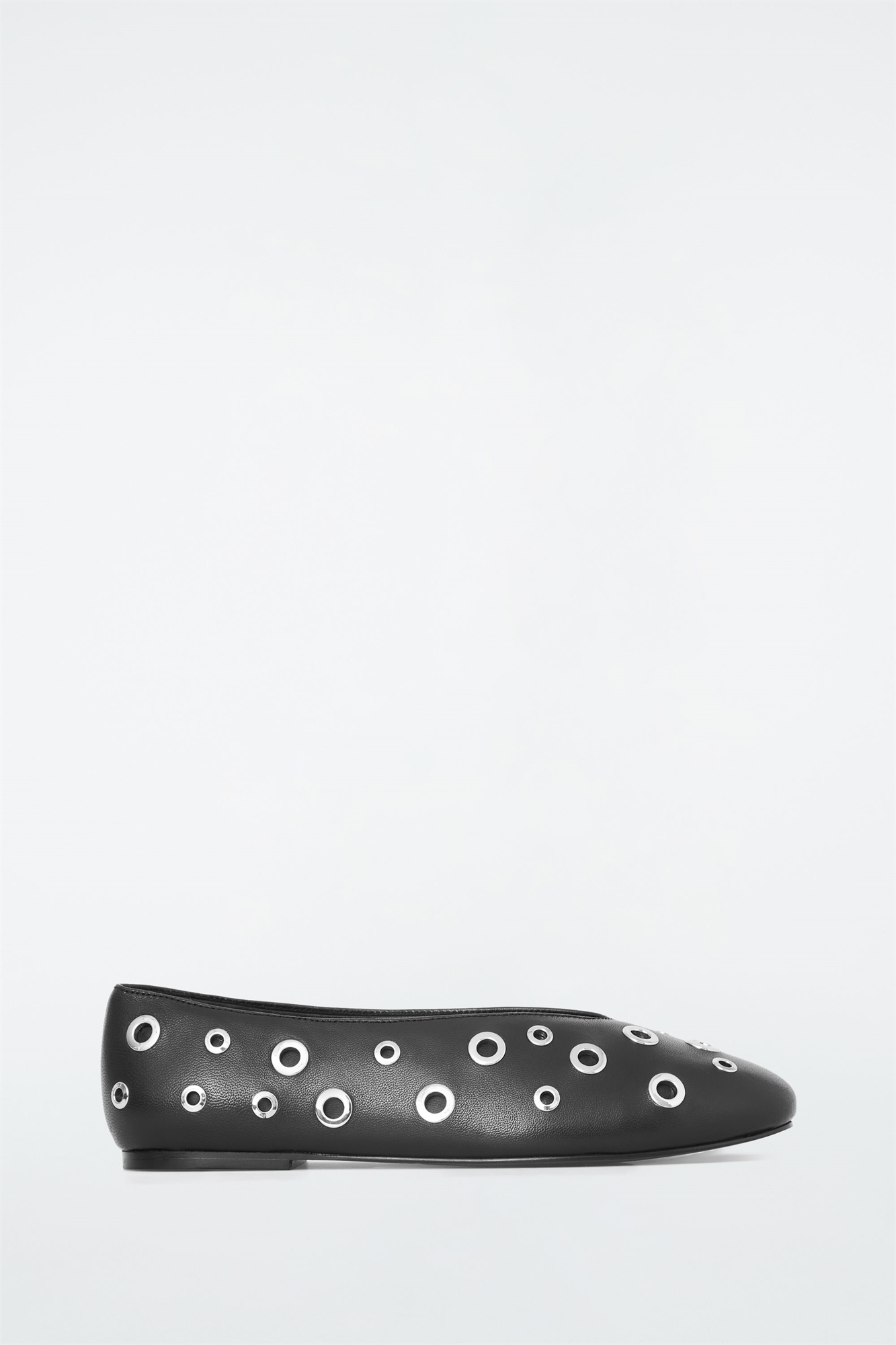 В этом сезоне команда женской одежды COS представляет современный подход к балеткам. Эти черные туфли на плоской подошве, выполненные из эластичной кожи без содержания хрома, имеют люверсы серебристого цвета, круглые мыски и V-образный мысок. Носите их сами по себе или с металлическими носками. COS поддерживает ответственное производство через Leather Working Group. Верх, подкладка и подошва: 100% кожа. Детали исключены