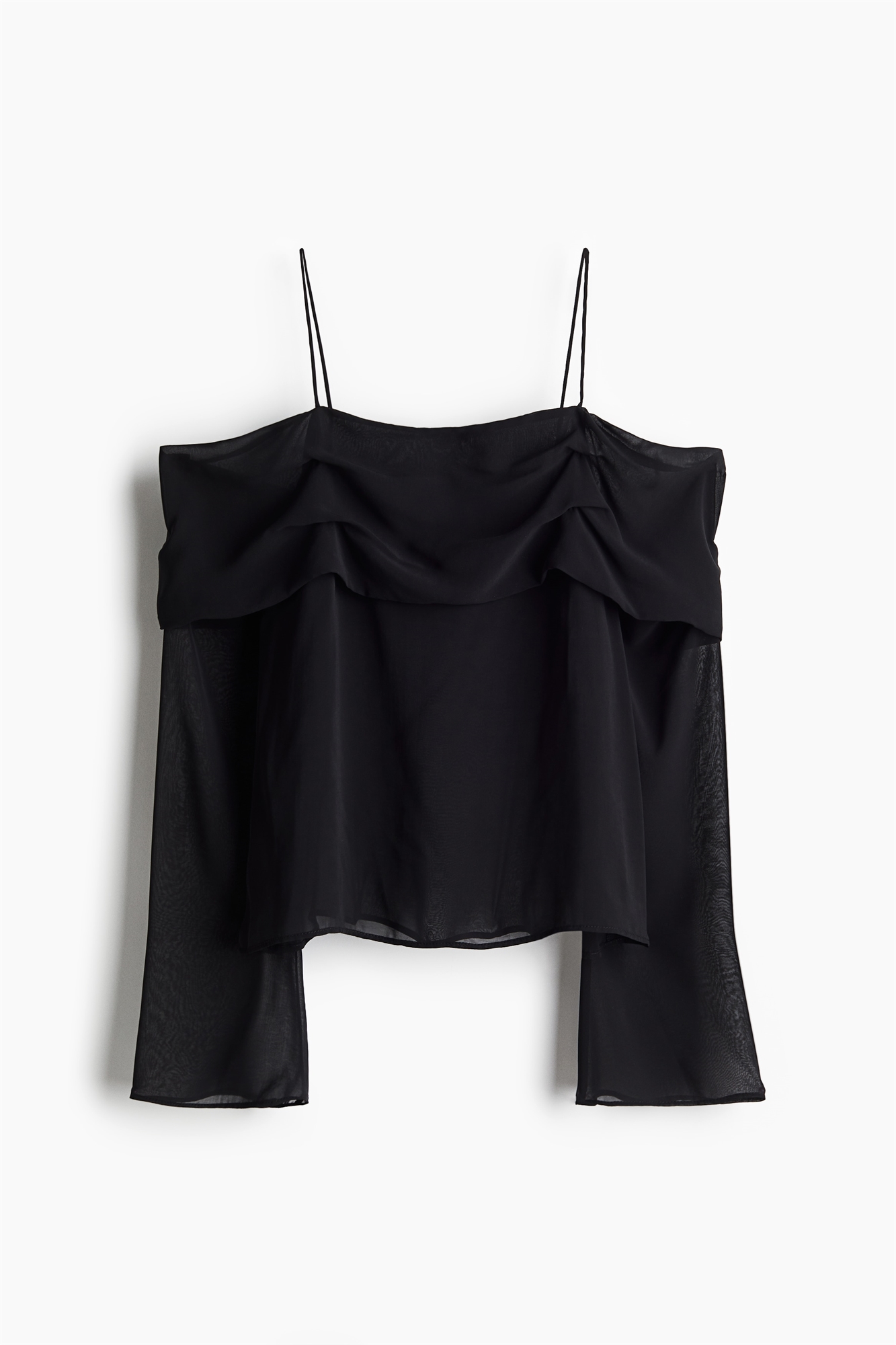 Облегающий топ без плеч из прозрачного шифона с широким откидным краем и сборками на спине для эффекта рюша. Бретели-спагетти, длинные рукава-трубы и потайная застежка на молнии и крючках с одной стороны. Без подкладки.