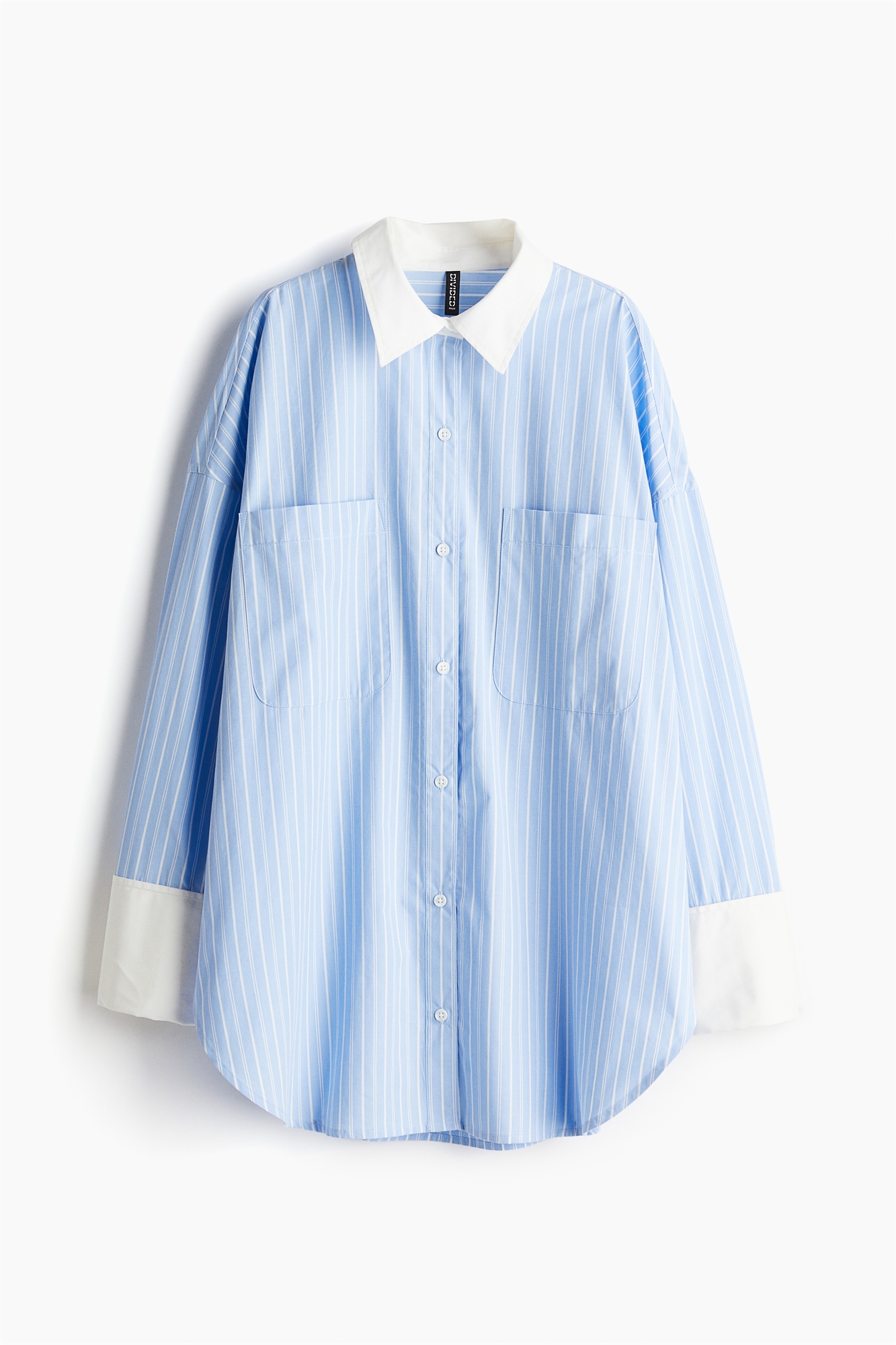 Рубашка оверсайз из хрустящего хлопкового поплина с воротником, пуговицами спереди и ярмом со складками сзади. Открытые нагрудные карманы, спущенные плечи, длинные рукава с широкими манжетами со складками на пуговицах и закругленный подол. Декоративная строчка в виде цепочки вдоль проемов карманов, на манжетах и по низу пуговичной ленты.