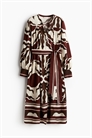 Свободное платье-кафтан длиной до колен из мягкого хлопка и вискозы с воротником-бантом, V-образной проймой и пуговицами спереди. Длинные рукава-баллоны и широкие манжеты на пуговицах. Съемный пояс-завязка на талии и подол прямого кроя с разрезом с каждой стороны. Без подкладки.