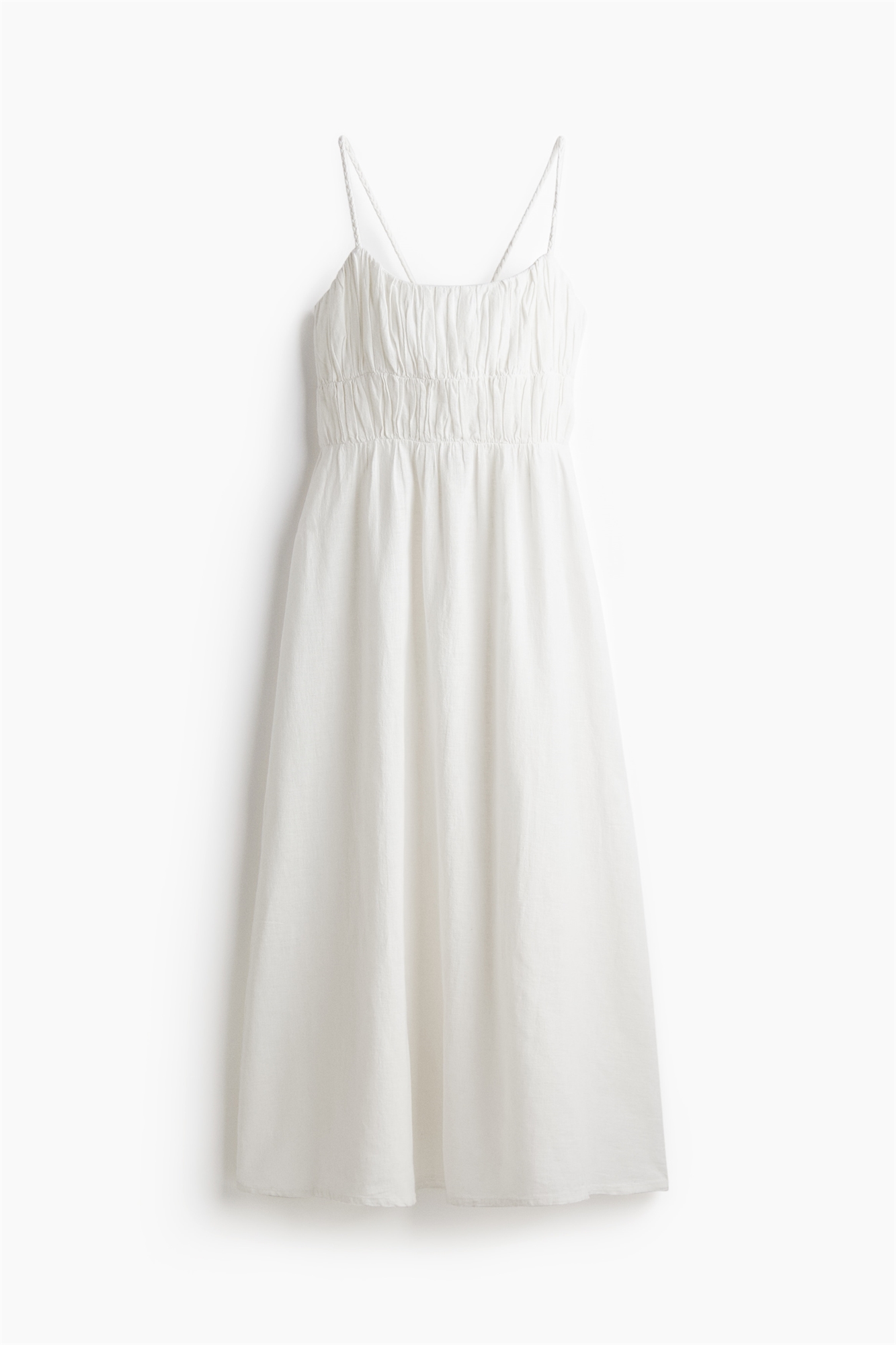 Слегка расклешенное платье длиной до колен из воздушной смеси льна и хлопка. Верхняя часть с прямым вырезом и открытым разрезом сзади. Узкие плетеные бретели, продетые через небольшие петли и завязывающиеся сзади. На подкладке.