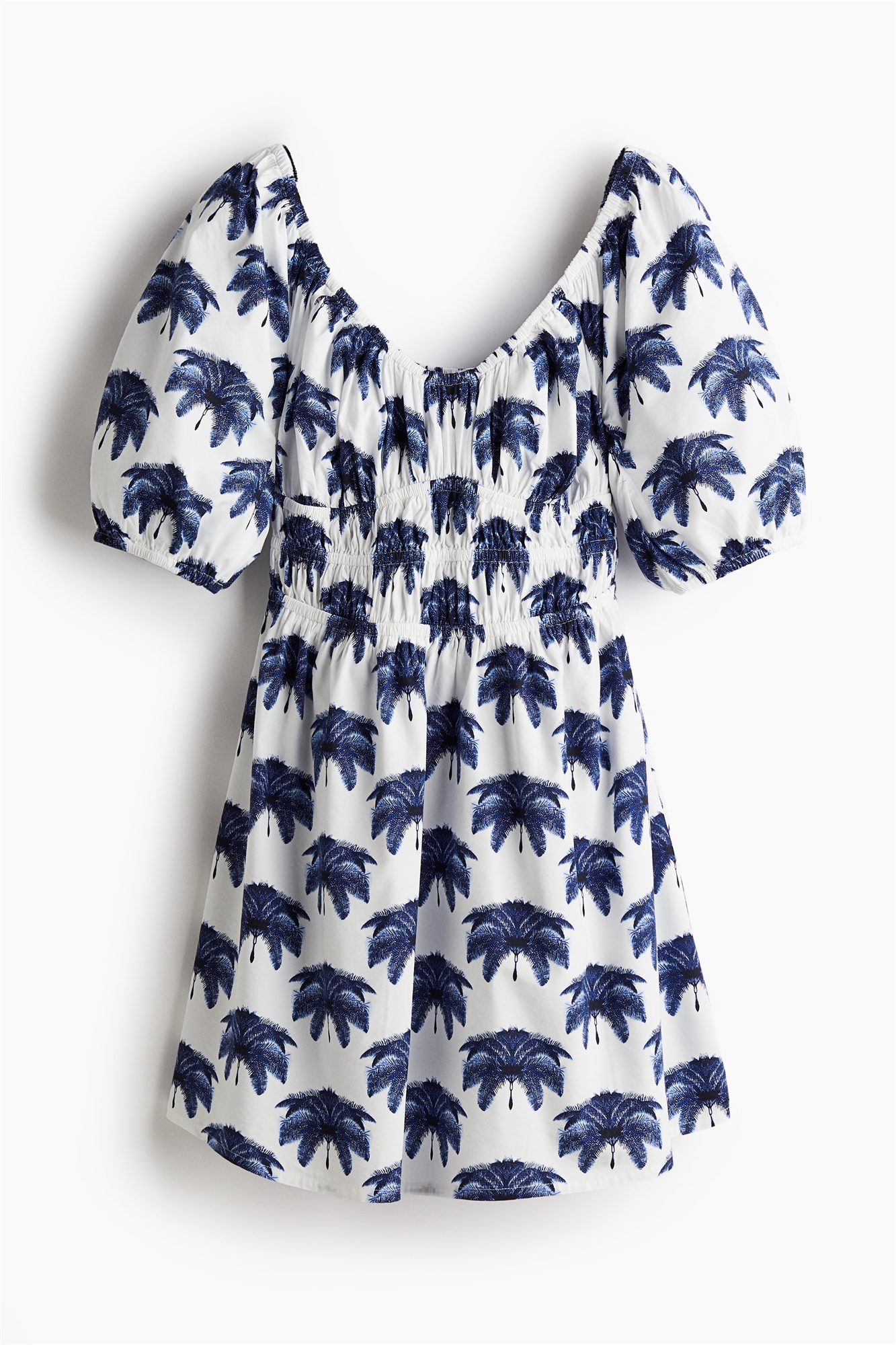 Короткое платье из хлопка и вискозы с эластичным вырезом-лодочкой, короткими рукавами-баллончиками, завязками на талии и расклешенной юбкой. Без подкладки.