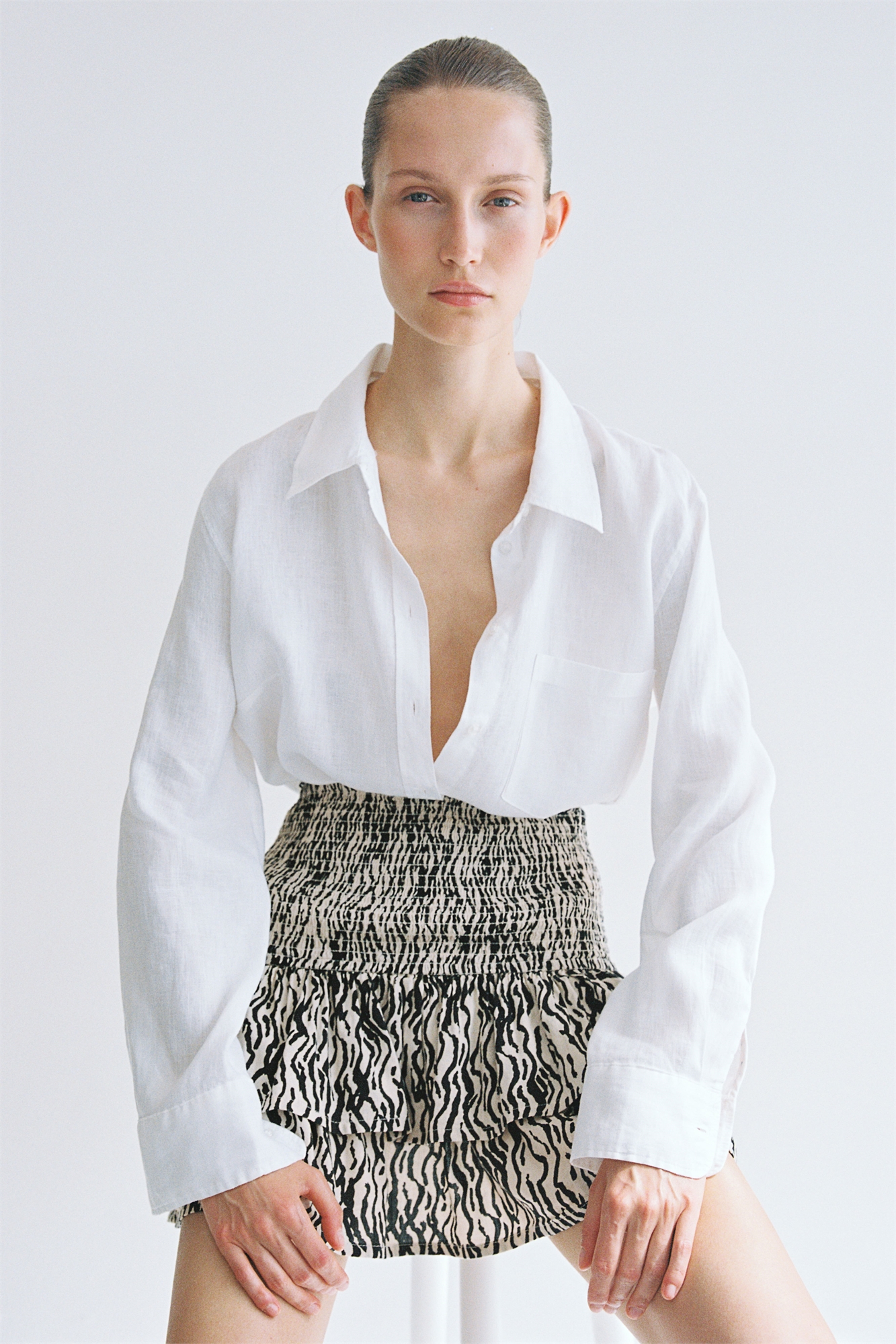 Короткая юбка из тканого материала с широким швом на талии и собранными ярусами для придания объема. Без подкладки.