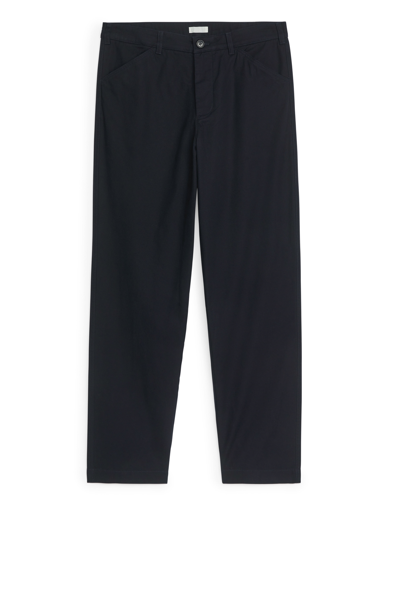 Брюки сшиты из хлопка. Модель дополнена косыми боковыми карманами и накладными карманами сзади. Застежка на пуговицы и молнию, а также крючок и планка. Регулярный крой.