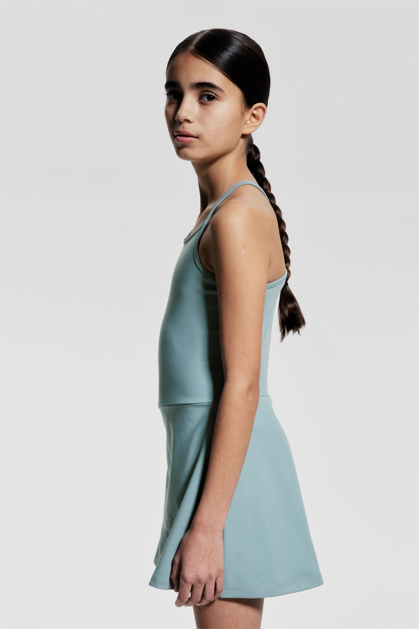 Спортивное платье из функциональной ткани DryMove™, которая отводит влагу от кожи, обеспечивая комфортную сухость во время движения. Квадратный вырез, узкие бретели, соединяющиеся сзади, и расклешенная юбка. Платье надевается поверх велошорт из джерси с открытым карманом на одной штанине. На подкладке.
