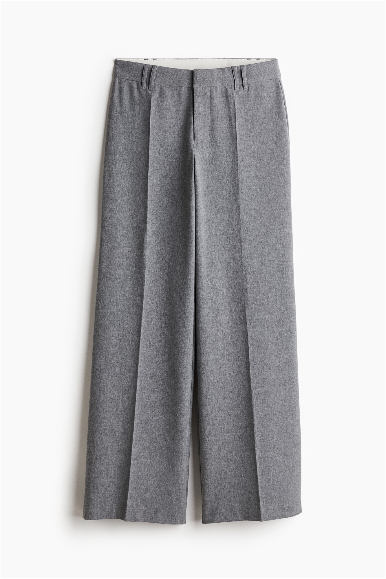 Брюки из саржи с заниженной талией и ширинкой на молнии с потайной застежкой на крючок и планку. Поддельные накладные карманы сзади и широкие ноги со складками спереди.
