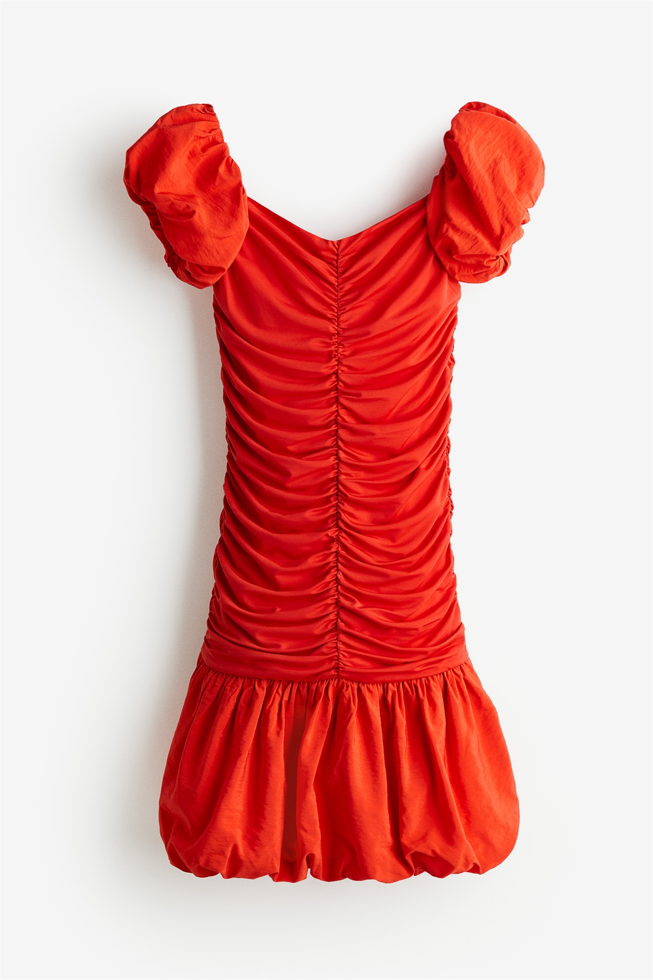Короткое приталенное платье без плеч из стрейчевого джерси со сборчатыми швами спереди, сзади и по боковым швам, создающими эффект рюша. Сборчатый шов ниже бедер. Короткие пышные рукава и объемная юбка, выполненные из хрустящего полотна с пузырчатым подолом для придания силуэту пышности. На подкладке.