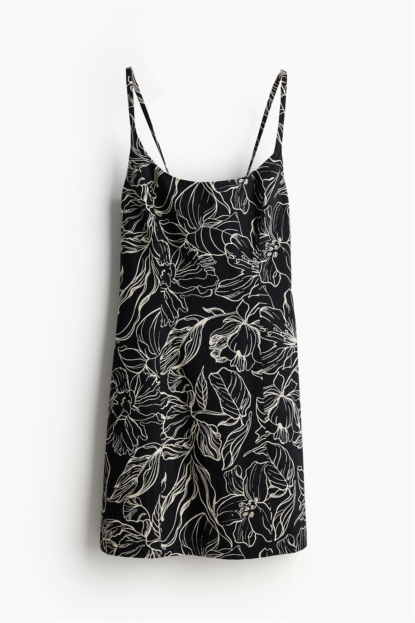 Короткое приталенное платье из хлопкового крепа с глубоким круглым вырезом и узкими бретелями, которые продеваются в петли и завязываются сзади. Скрытая застежка-молния и застежка-крючок с одной стороны. Частично на подкладке.