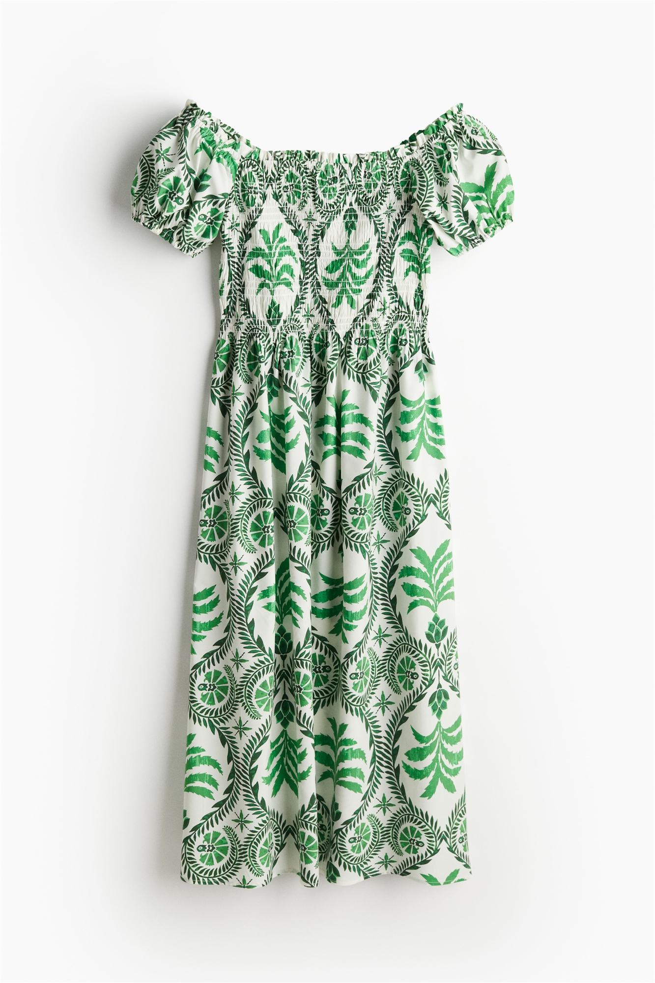 Платье на плечах из хрустящего поплина из смеси хлопка и вискозы. Узкая оборка в верхней части, расклешенный лиф и короткие пышные рукава с эластичными манжетами. Сборки на талии и расклешенная юбка. Без подкладки.