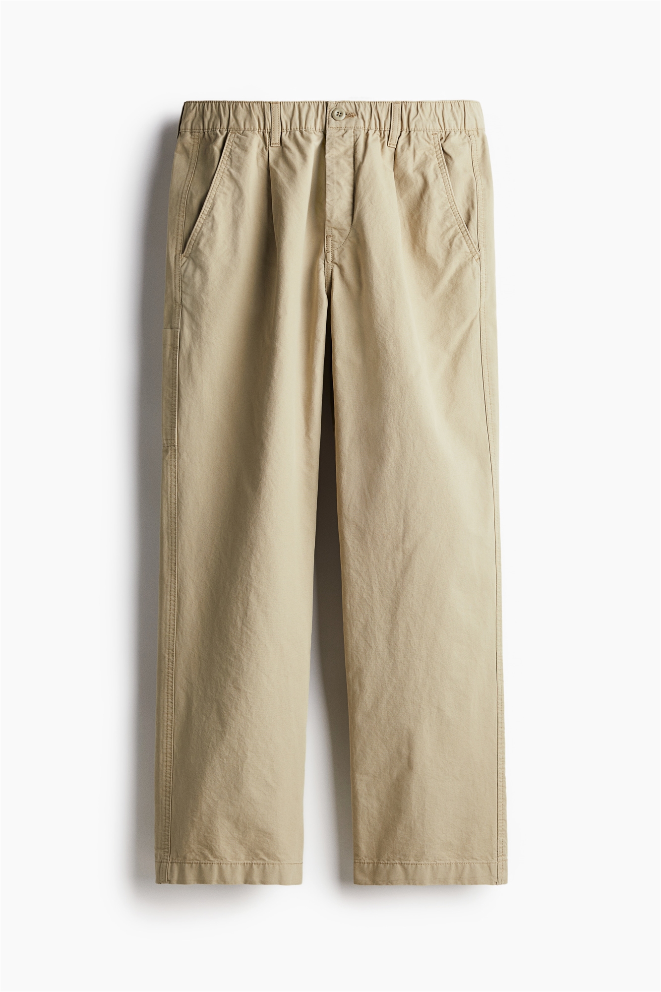 Брюки из хлопковой саржи с эластичным поясом, складками в верхней части и прямыми ногами. Диагональные боковые карманы, открытый задний карман и открытый карман на штанине. Свободный крой для непринужденного, но не чрезмерного силуэта.