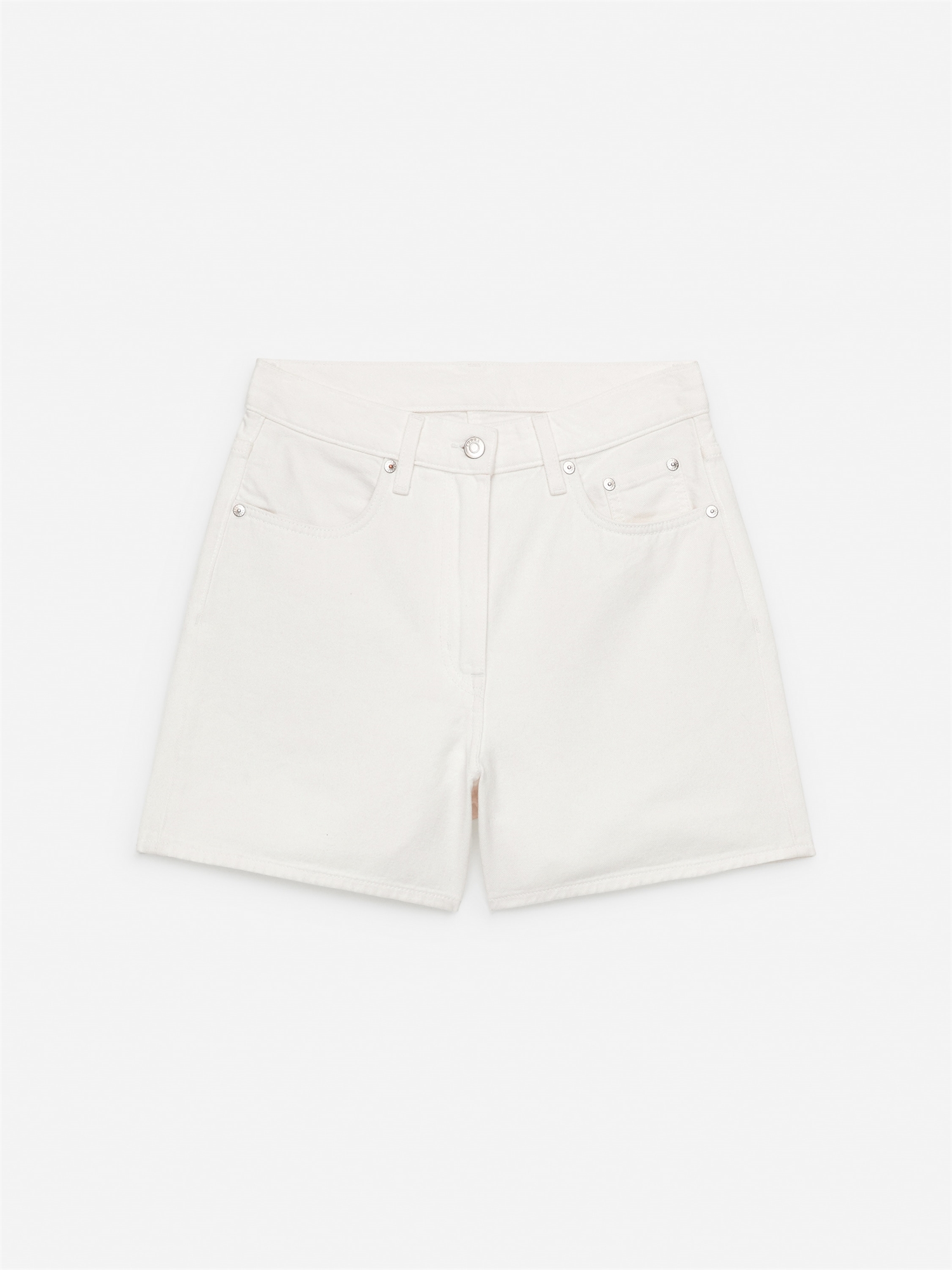Шорты с пятью карманами из жесткой джинсовой саржи. Фасон со средней талией и обычным кроем, длина до середины бедра. Внутренняя длина штанины 11,2 см (размер 28).
