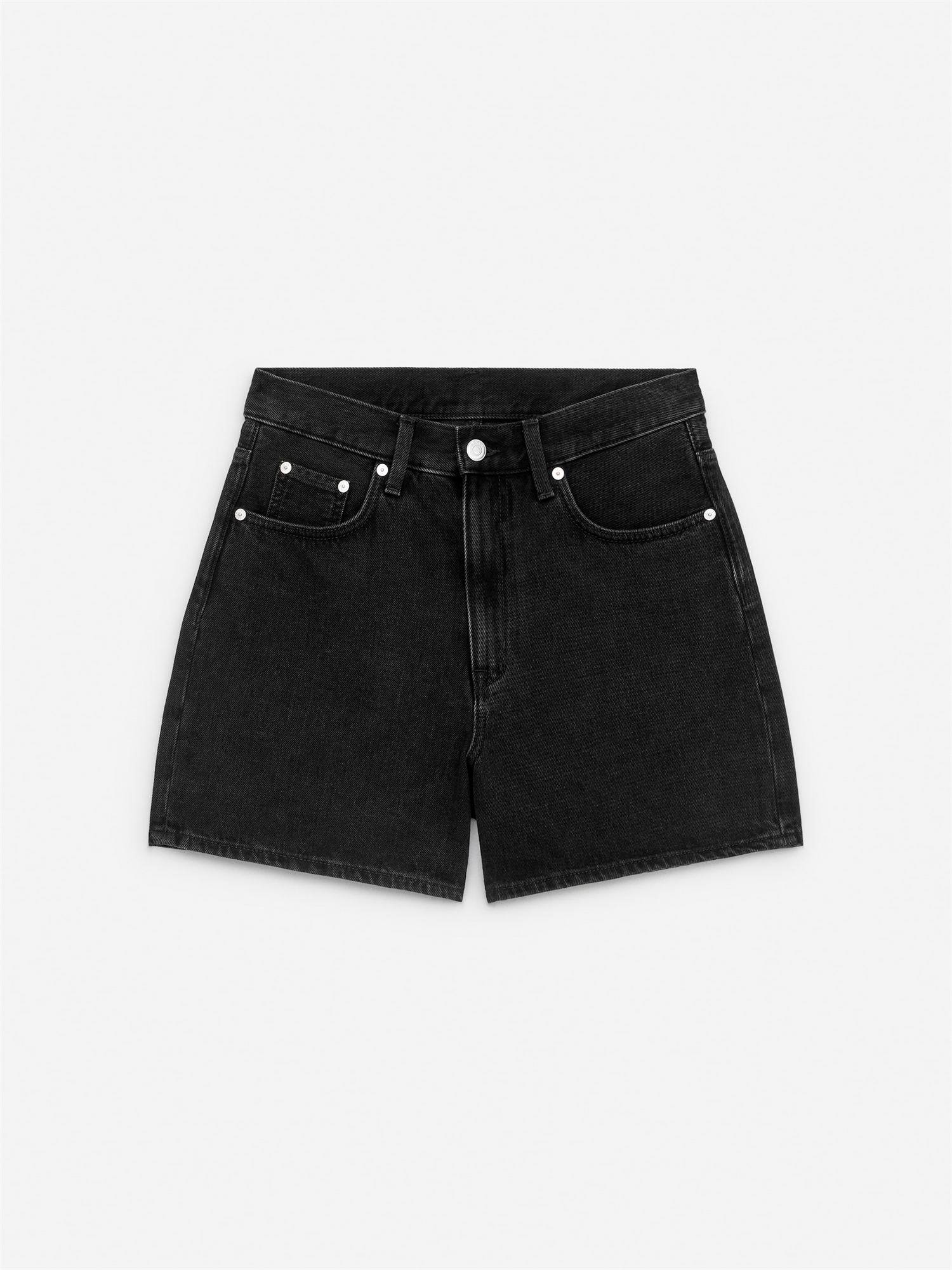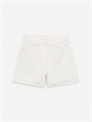 Шорты с пятью карманами из жесткой джинсовой саржи. Фасон со средней талией и обычным кроем, длина до середины бедра. Внутренняя длина штанины 11,2 см (размер 28).