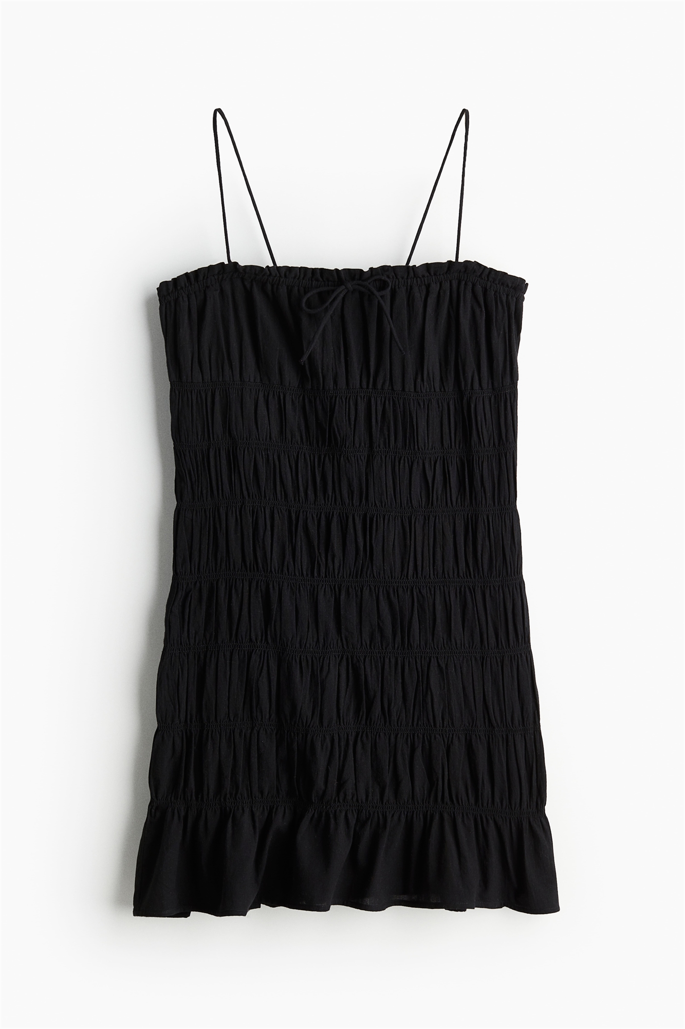 Короткое, приталенное платье с плавками из воздушного хлопкового полотна с прямым разрезом в верхней части и небольшой оборкой. Декоративные банты спереди, бретельки-спагетти и прямой подол. На подкладке.