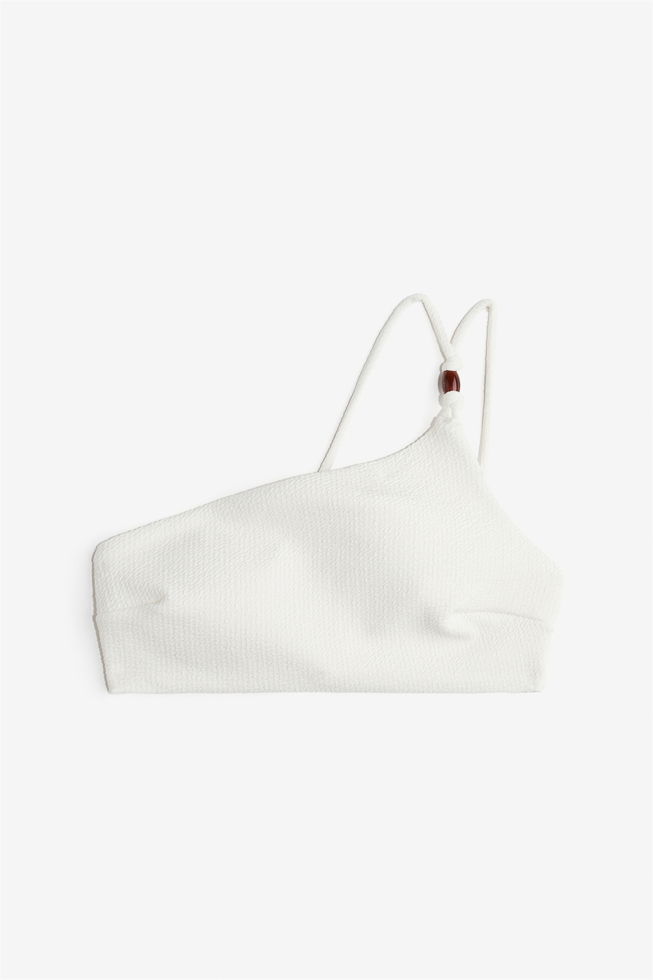Бикини на подкладке, без проводов, с асимметричным вырезом и узкой бретелью на два плеча с декоративной бусиной спереди. Чашечки со съемными вставками, придающими форму бюсту и обеспечивающими хорошую поддержку. Без застежек.