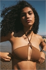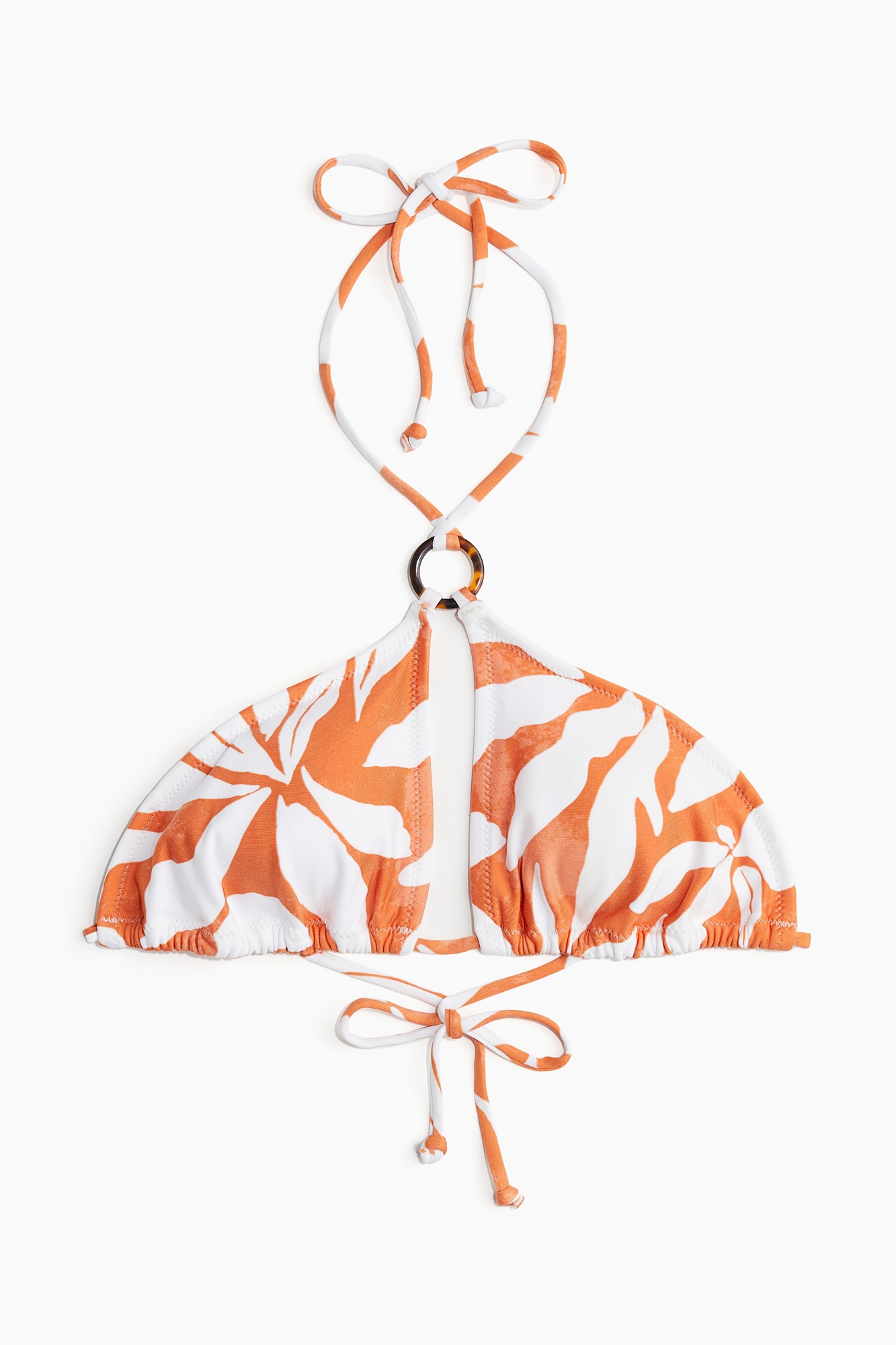 Бикини на подкладке, без проводов, с завязками на шее, декоративным кольцом спереди и чашечками со съемными вставками, придающими форму бюсту и обеспечивающими хорошую поддержку. Завязки сзади.
