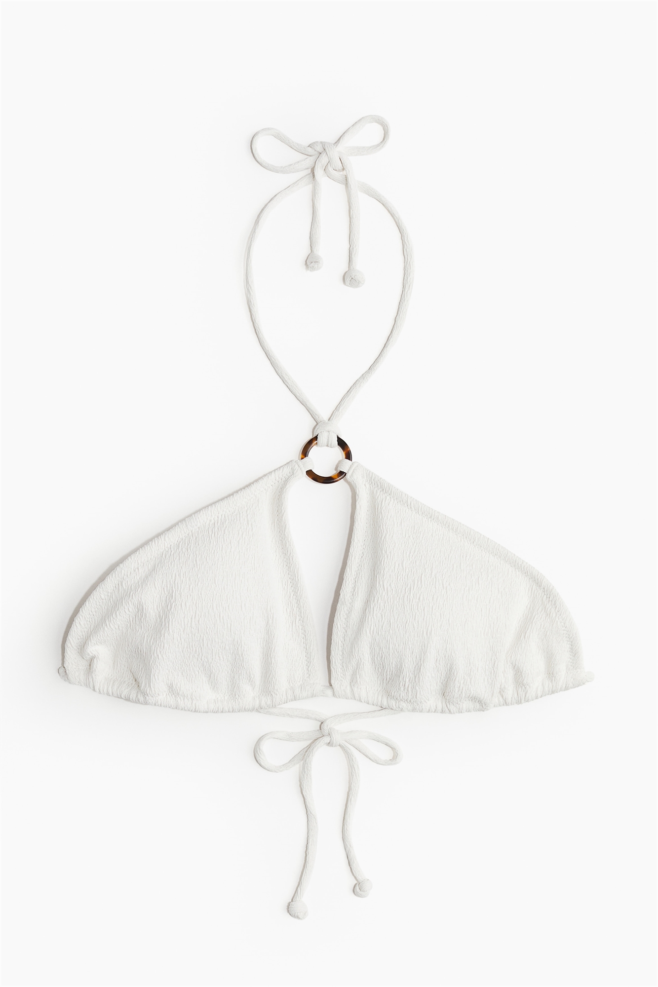 Бикини на подкладке, без проводов, с завязками на шее, декоративным кольцом спереди и чашечками со съемными вставками, придающими форму бюсту и обеспечивающими хорошую поддержку. Завязки сзади.