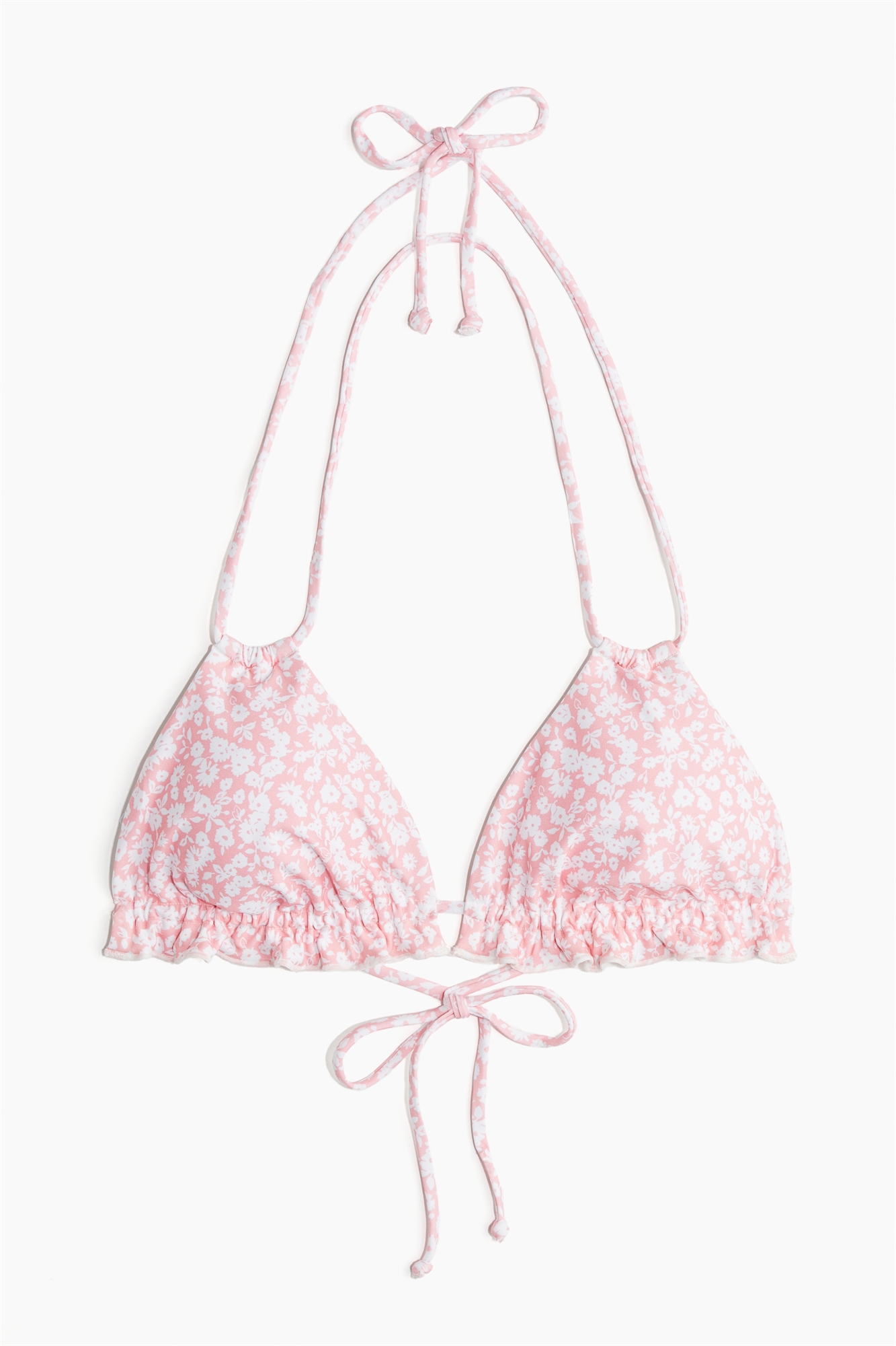 Бикини-треугольник без подкладки с двойными регулируемыми бретелями и чашечками со съемными вкладышами, которые формируют бюст и обеспечивают хорошую поддержку. Завязки сзади и небольшая оборка с оверлоком по подолу.