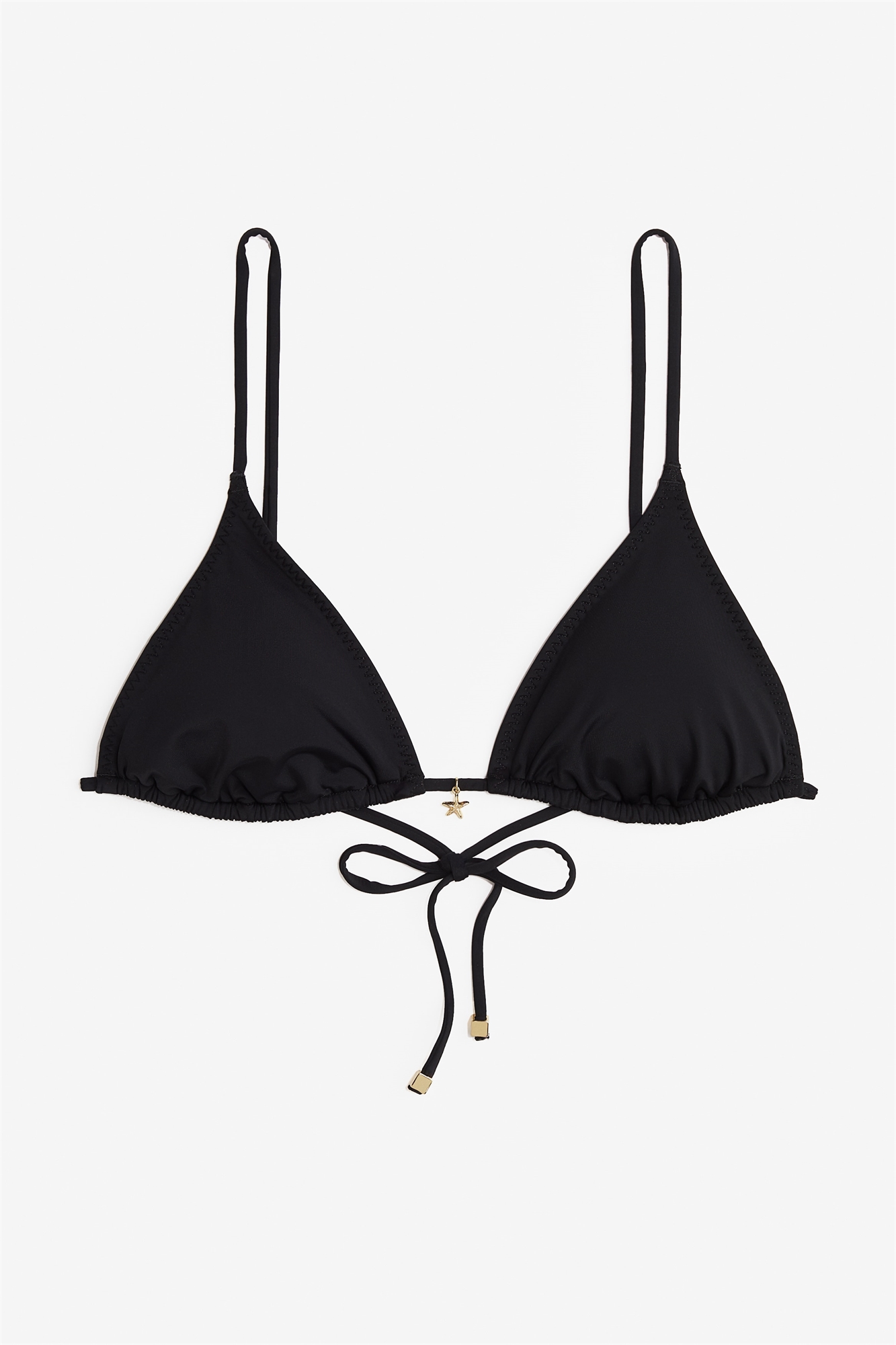 Бикини-треугольник без подкладки с подвеской в виде морской звезды спереди, узкими регулируемыми бретелями и чашечками со съемными вкладышами, которые придают форму бюсту и обеспечивают хорошую поддержку. Завязки сзади.