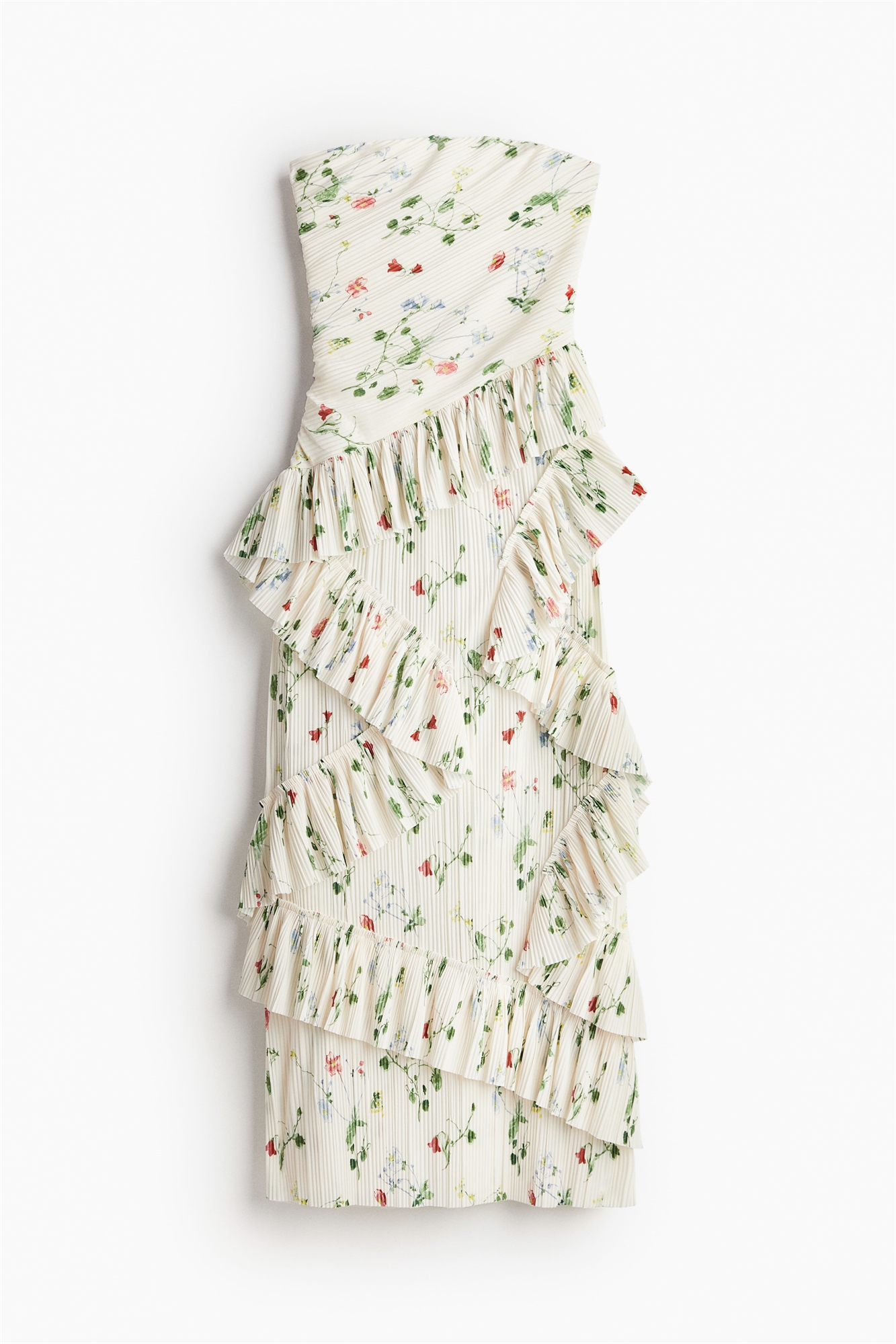 Приталенное платье-бандо длиной до щиколоток из джерси плиссе со скрытой силиконовой отделкой в верхней части, чтобы оно держалось на месте. Скрытая застежка-молния и застежка-крючок с одной стороны, диагональные оборки по юбке и необработанный подол. На подкладке.
