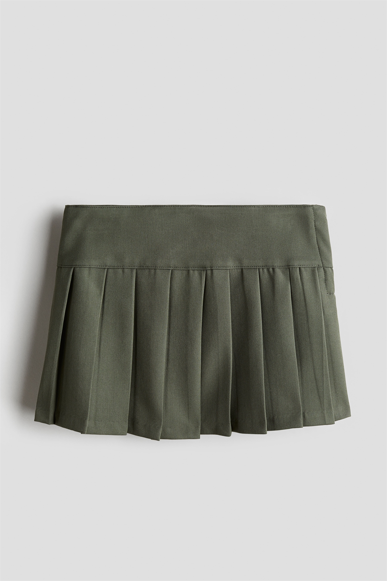Юбка из саржи с регулируемой резинкой на талии, застежкой на молнию с потайной кнопкой с одной стороны и видимым швом со складками над подолом. Без подкладки.
